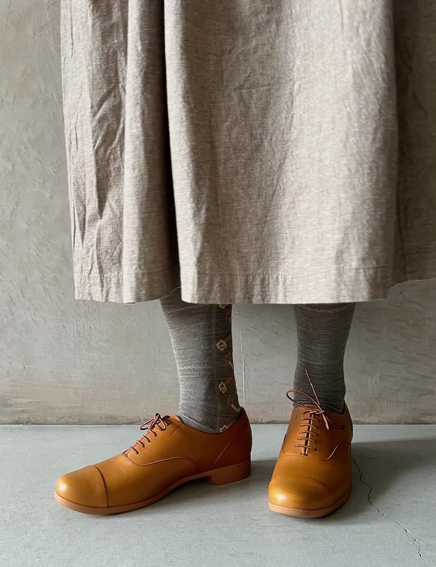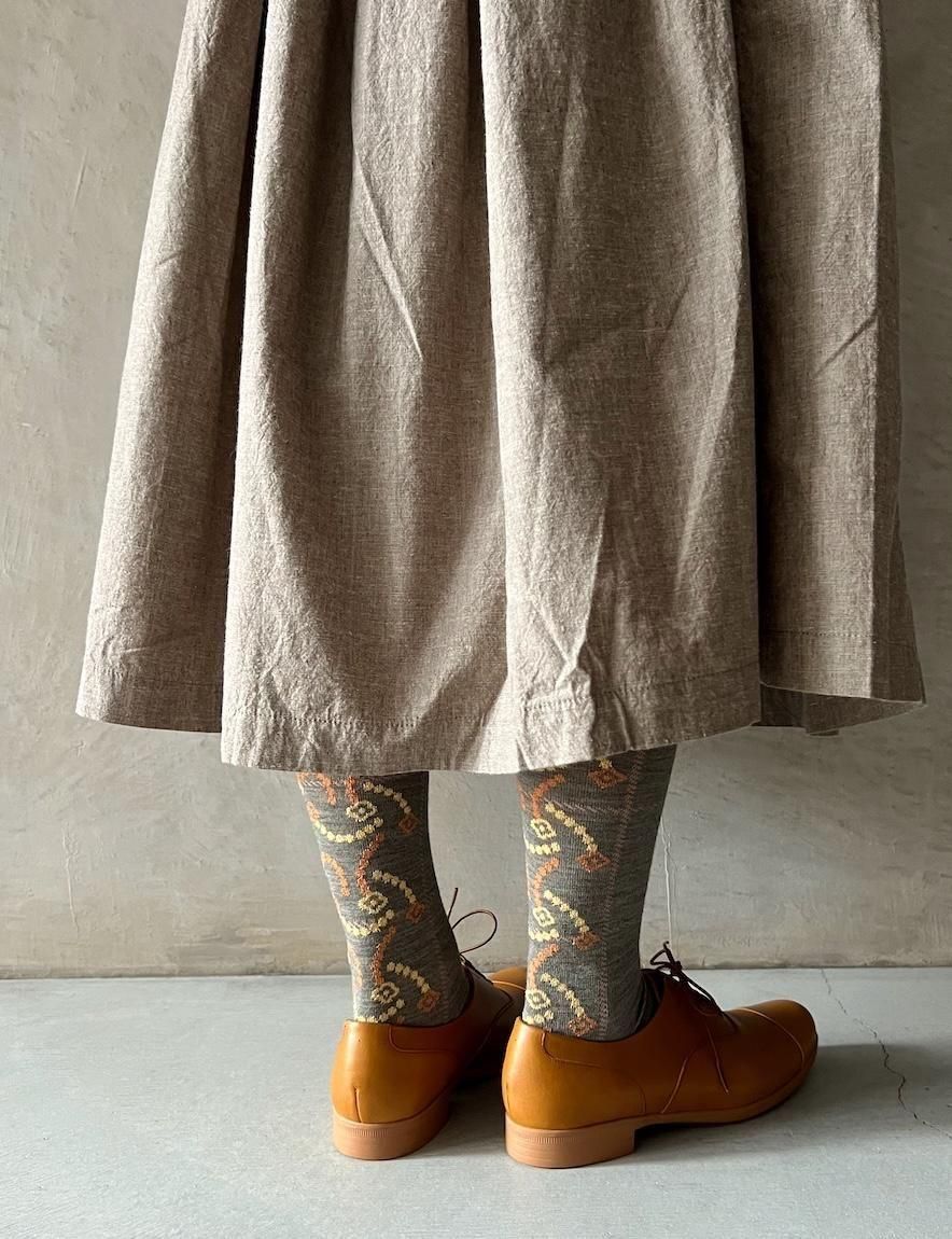 ベースにウール糸を、花柄の部分にはブークレ糸を使用したハイソックス。