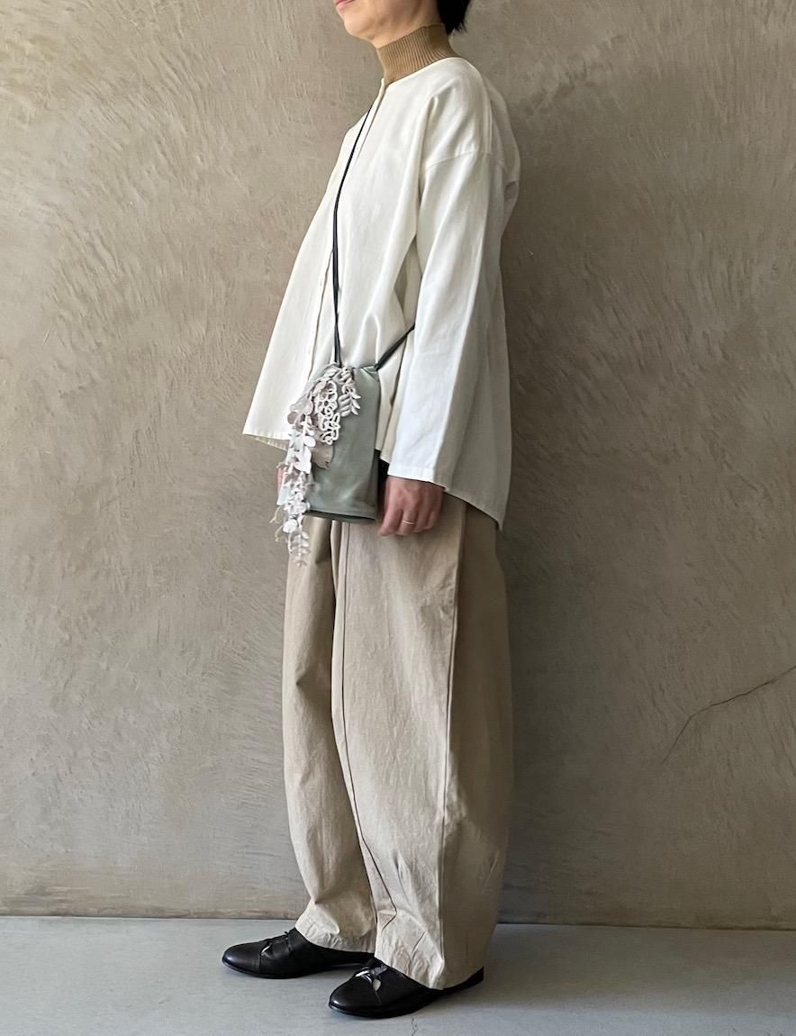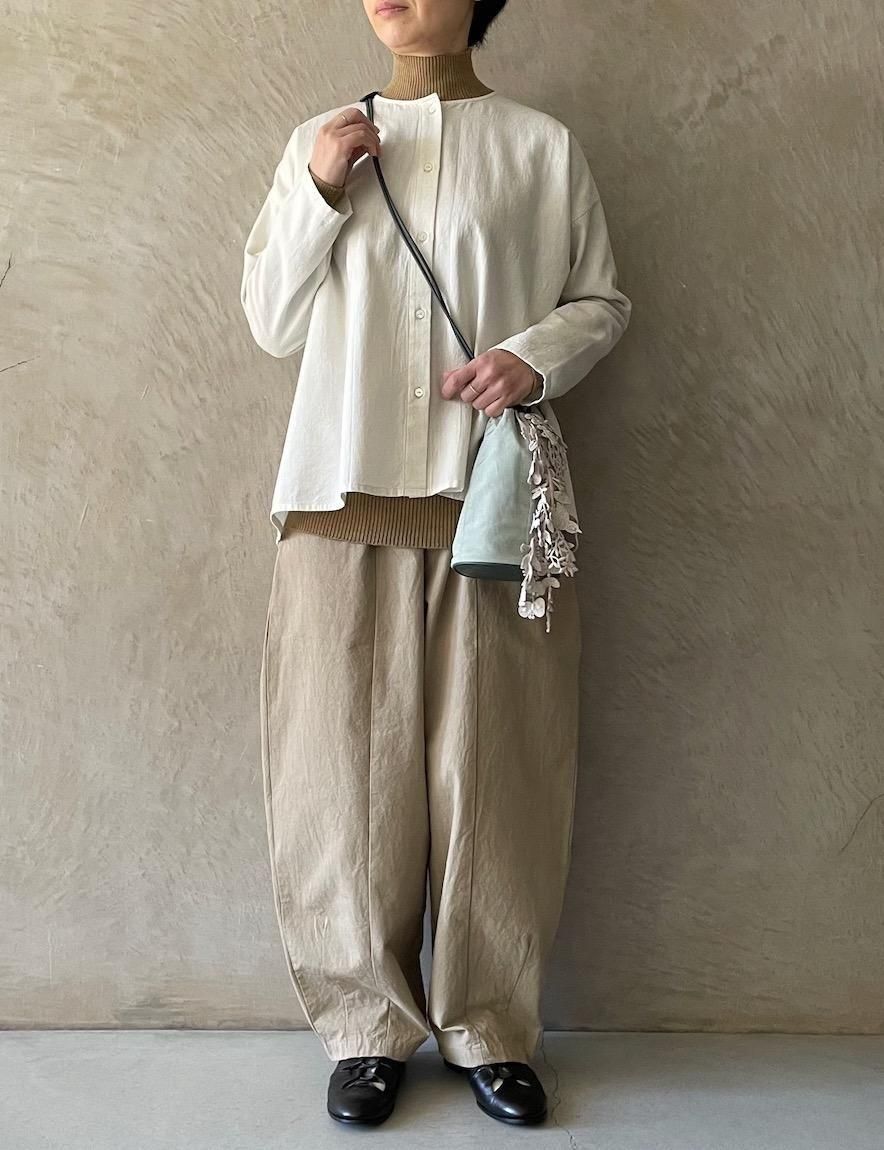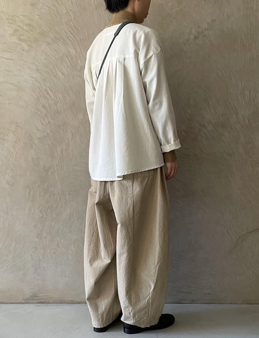裾にタックを入れて前後4枚ハギで仕上げた立体的な形が特徴的なパンツ。