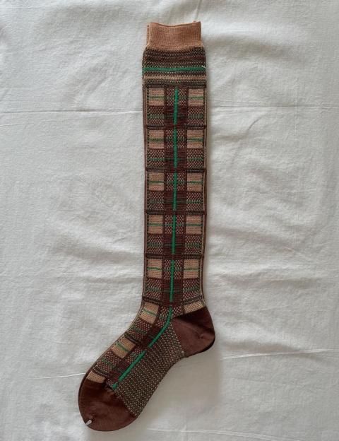 そのシーズンのソックスの柄を前身頃に、無地ニットを後身頃に組み合わせています。