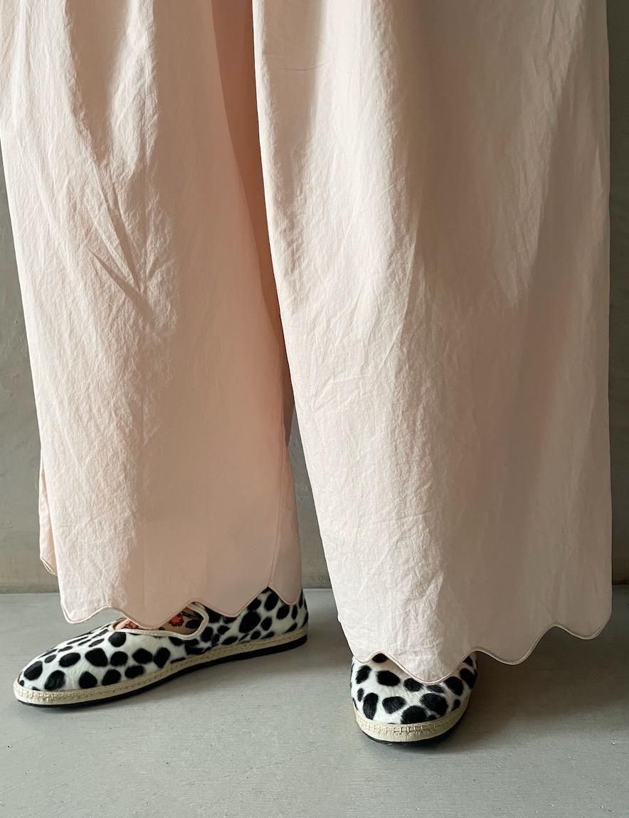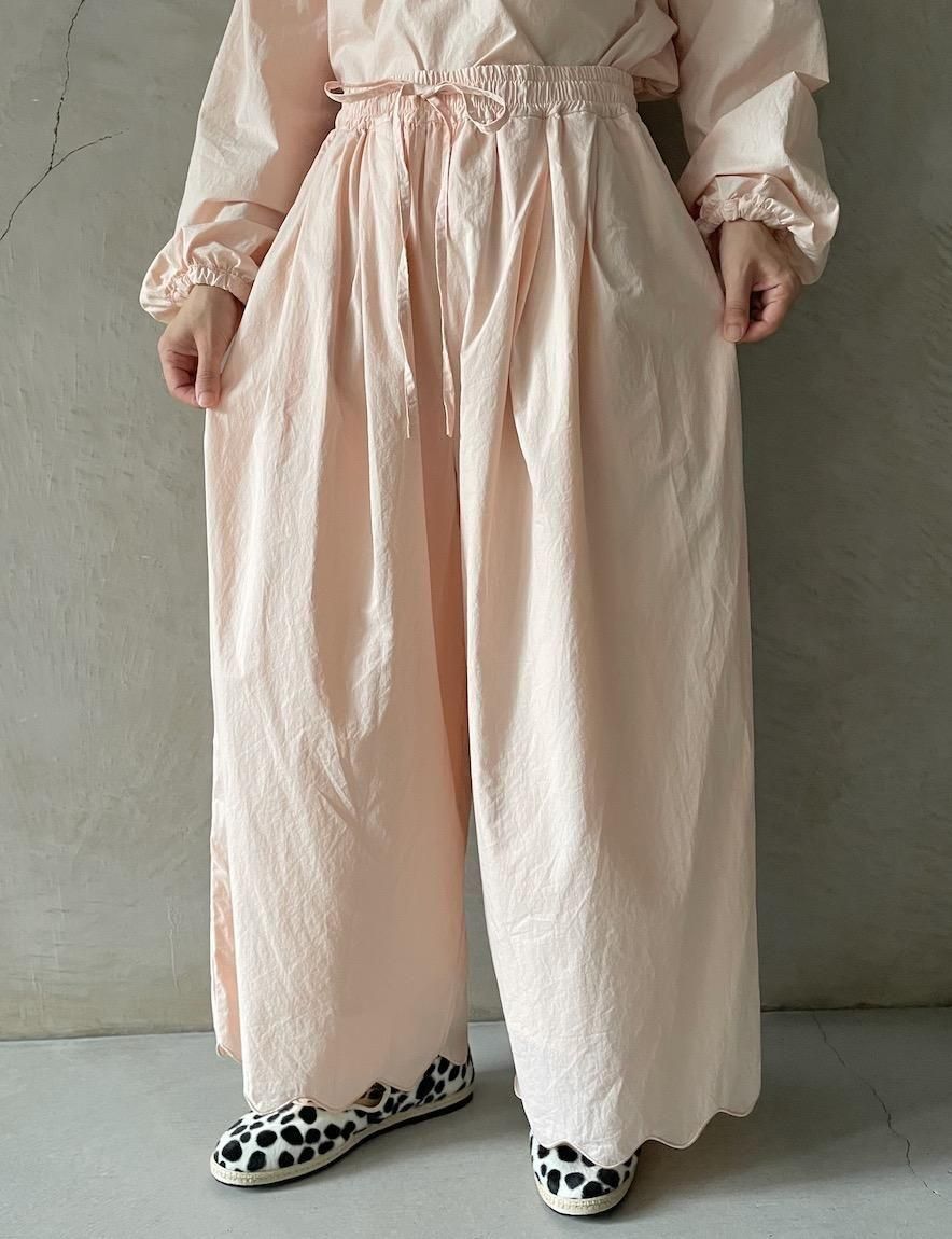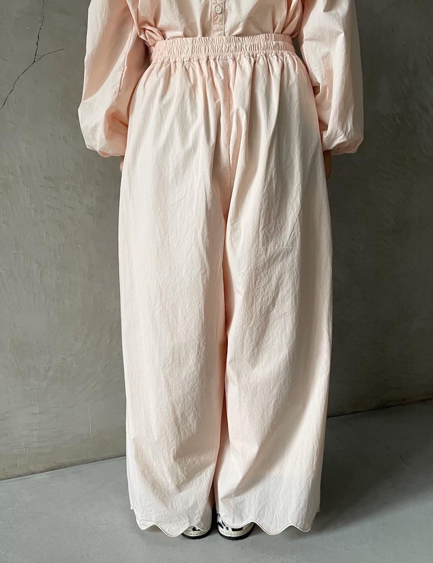 パンツ裾にシンプルなスカラップ刺繍を施したイージーパンツ。