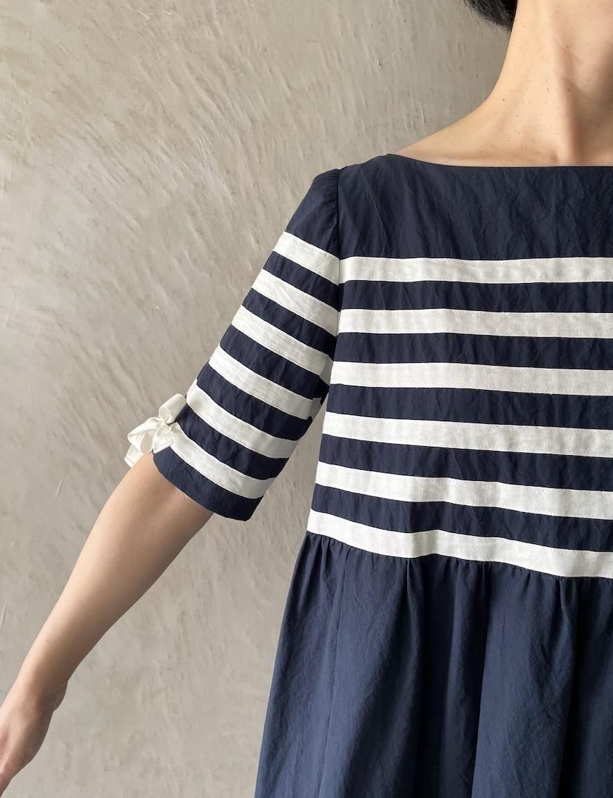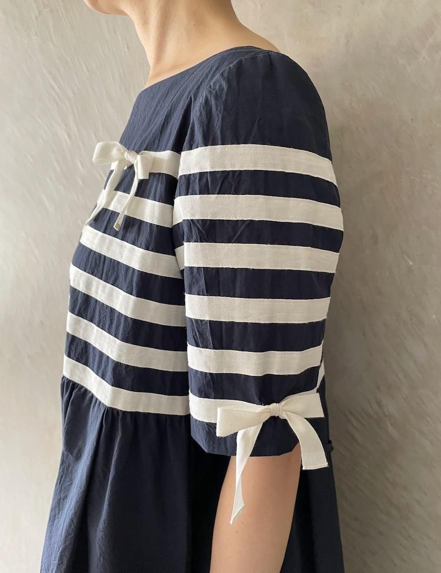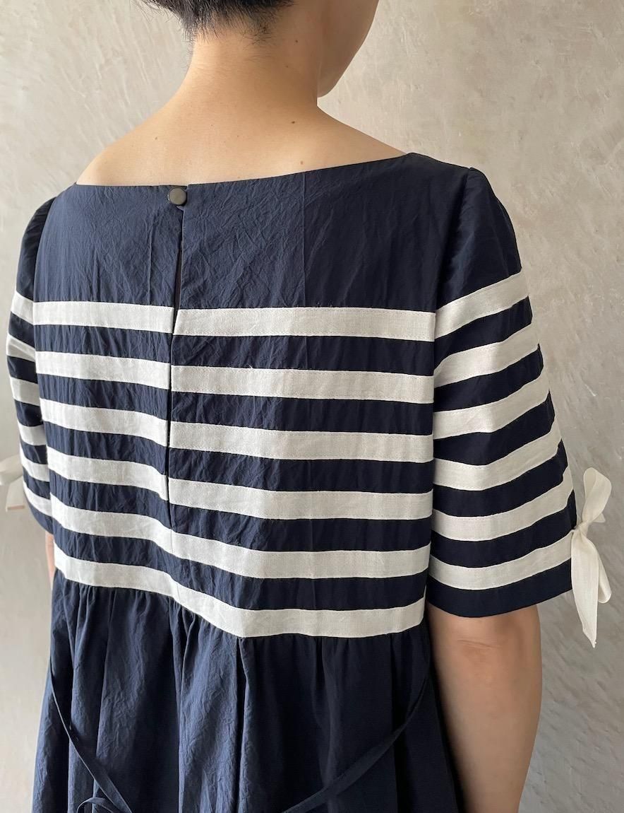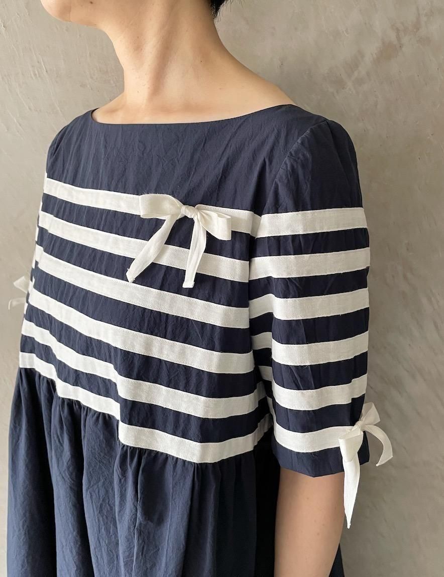 身頃と袖にあしらわれたマリンボーダーは、一本一本のリボンを丁寧に縫い合わせることで