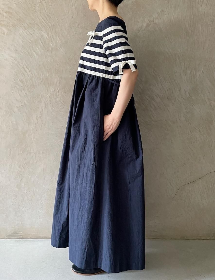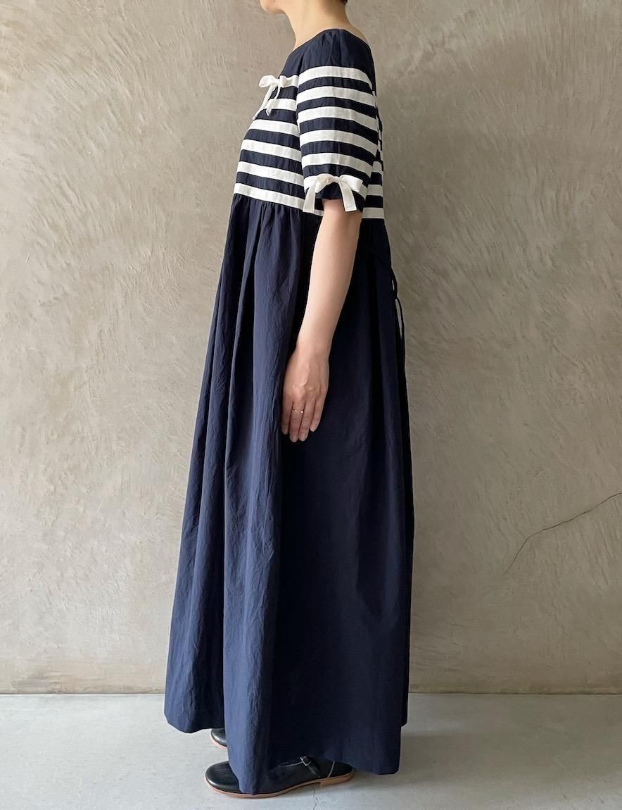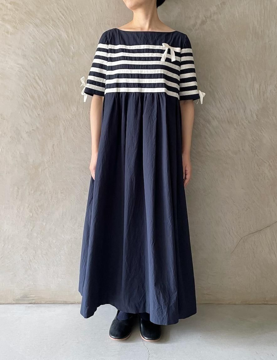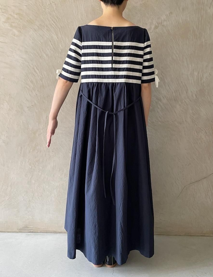 身頃と袖にあしらわれたマリンボーダーは、一本一本のリボンを丁寧に縫い合わせることで