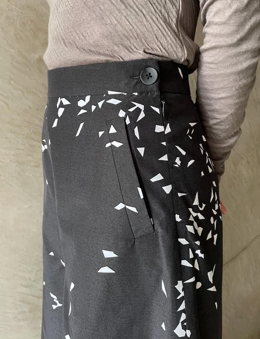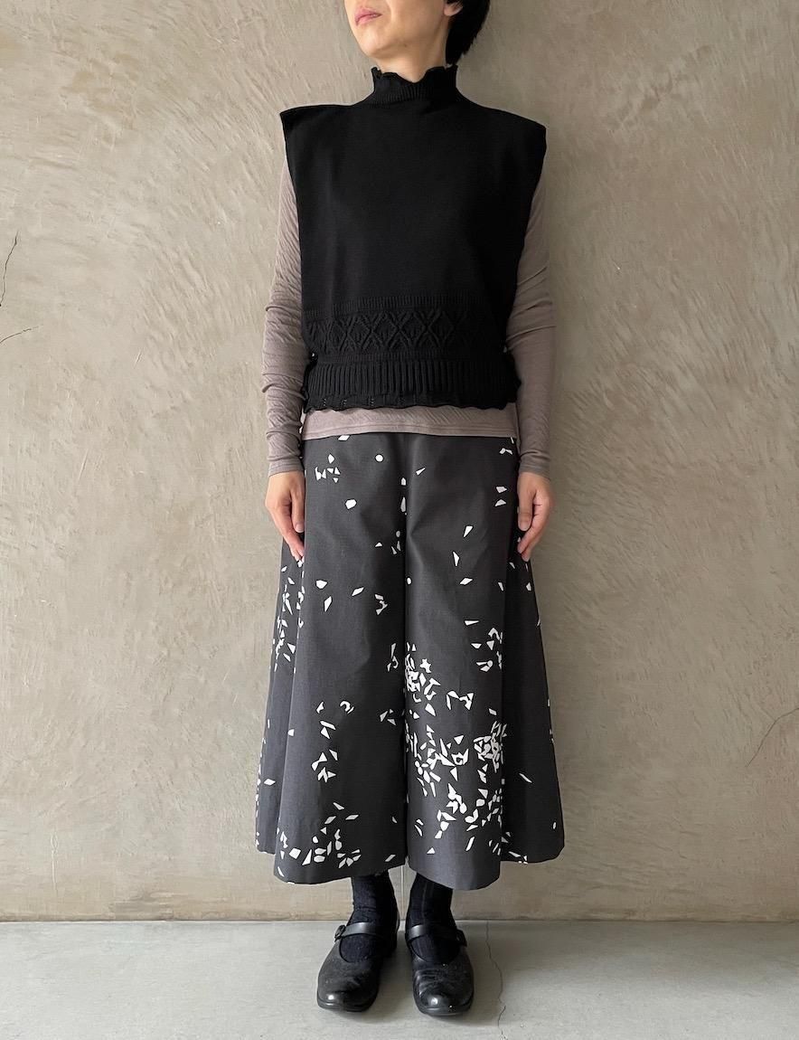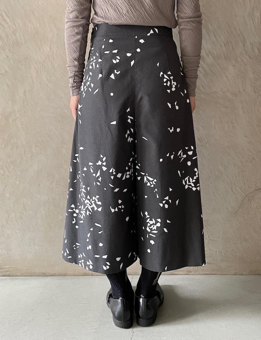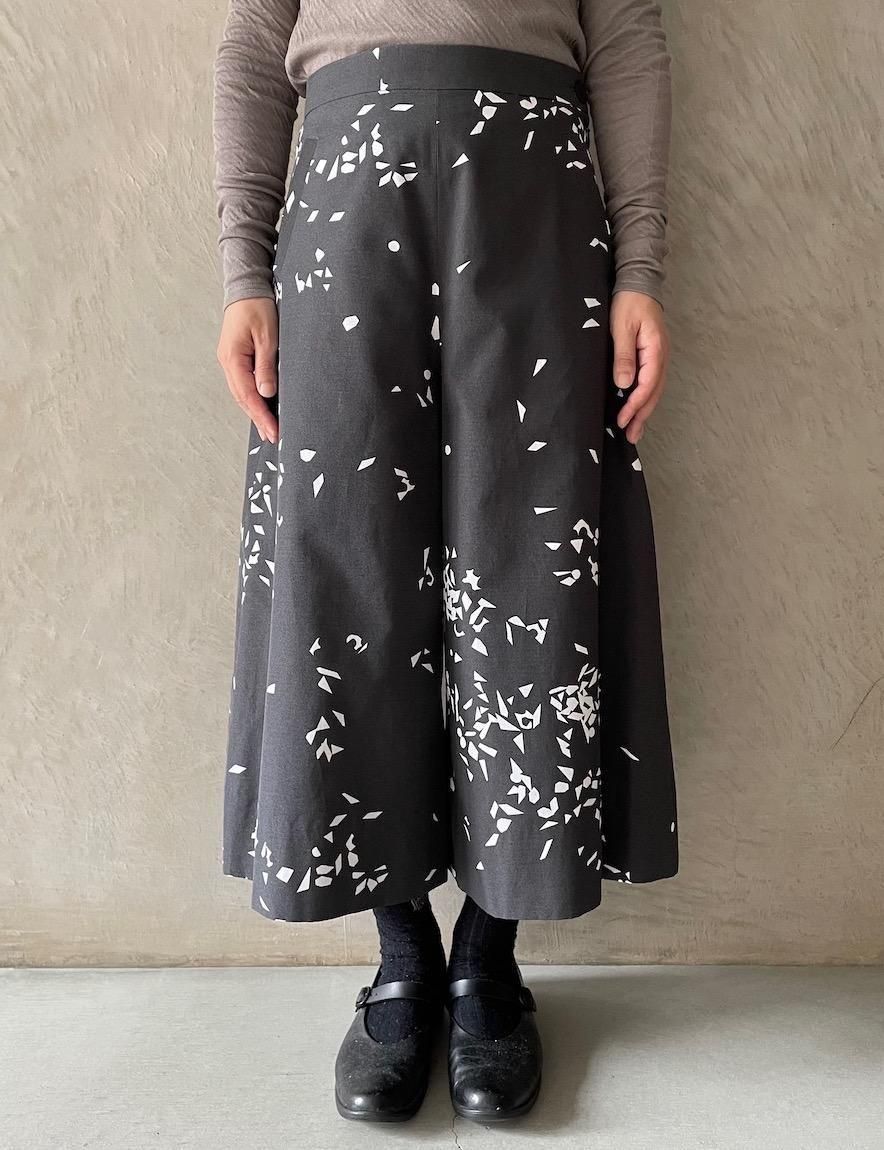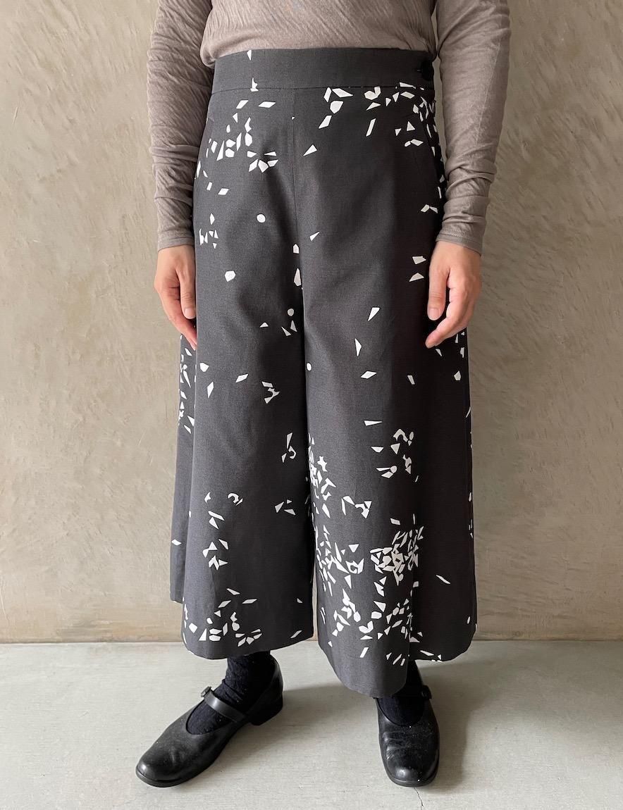 経糸にフィラメントシルク、緯糸コットン糸を使用した生地で仕立てたキュロットパンツ。