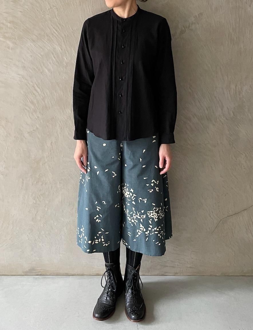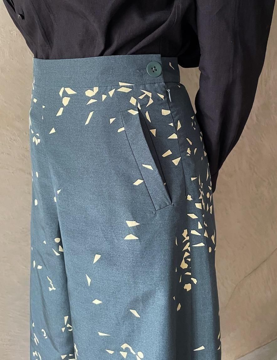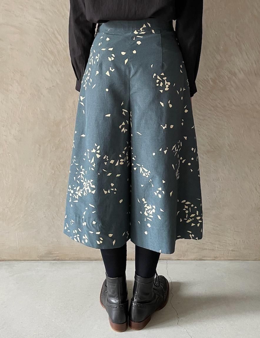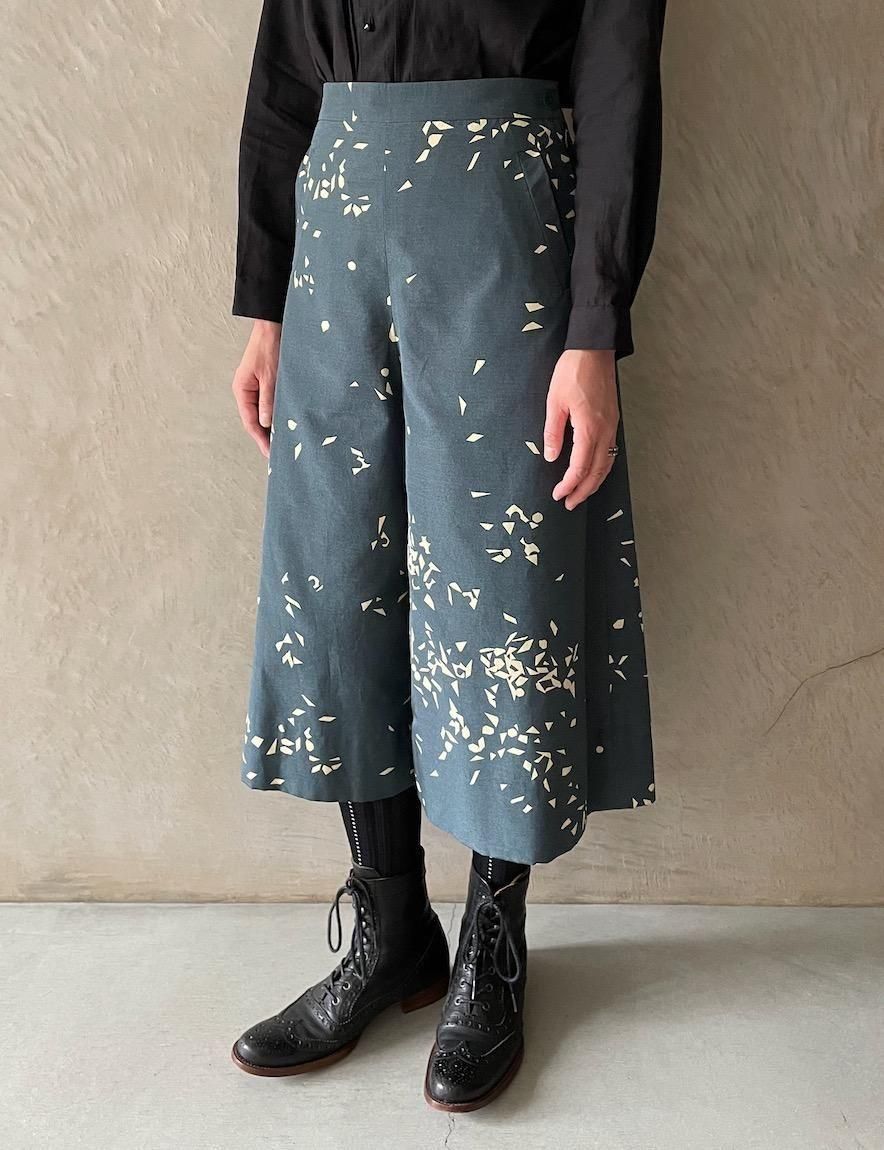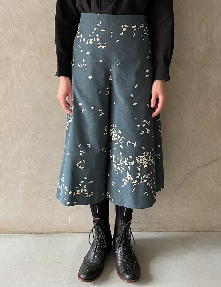 経糸にフィラメントシルク、緯糸コットン糸を使用した生地で仕立てたキュロットパンツ。