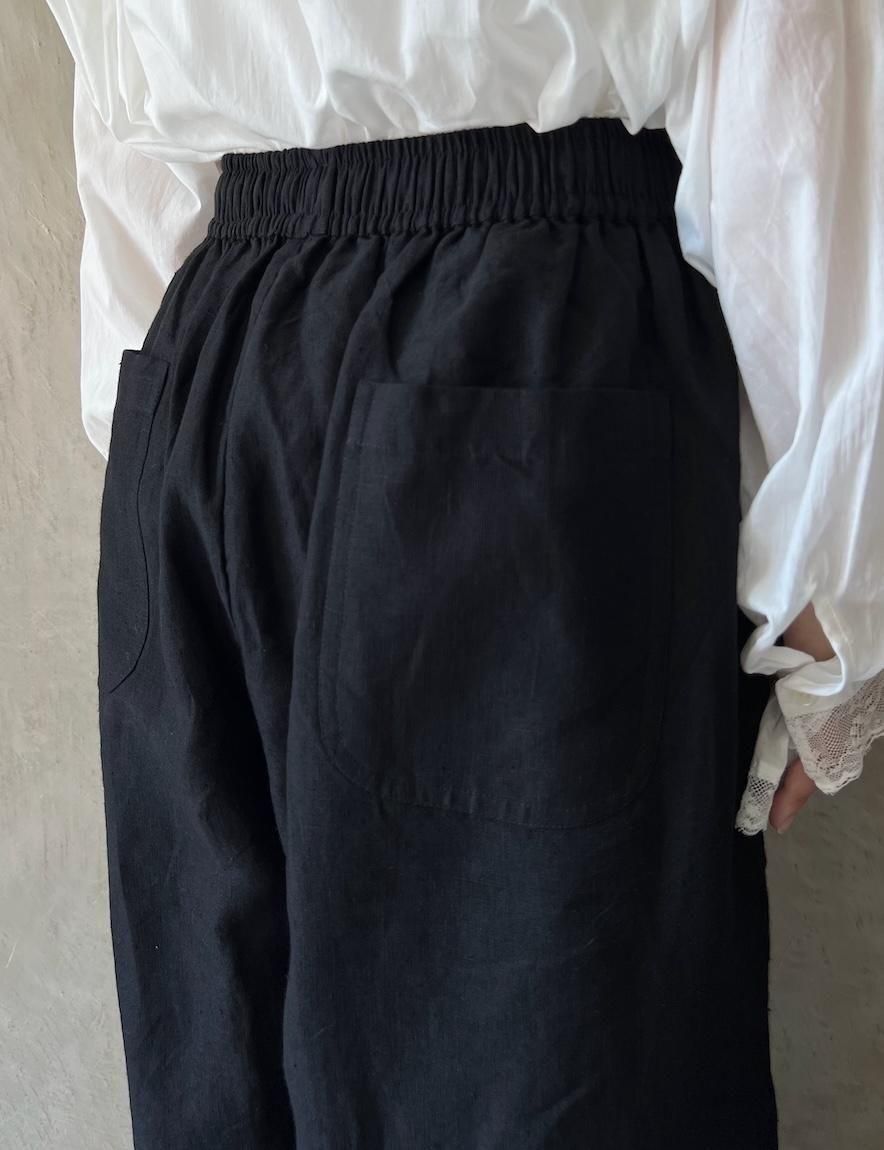 ウエストは総ゴム+紐仕様。深い股上にバックポケット。両サイドにもポケットがあります。