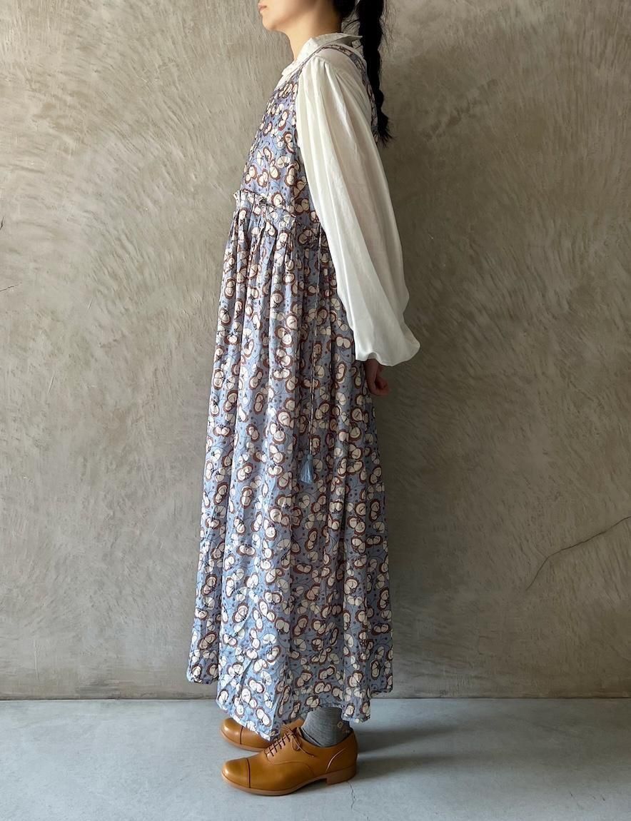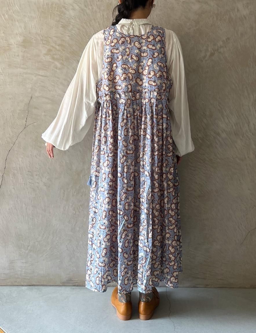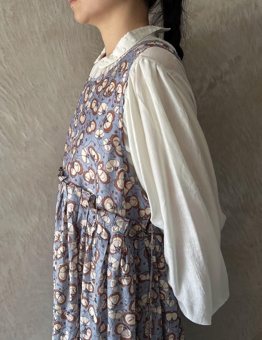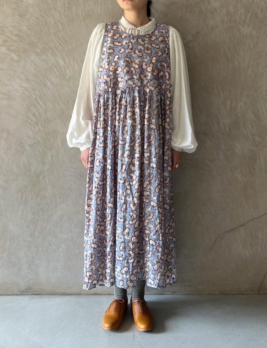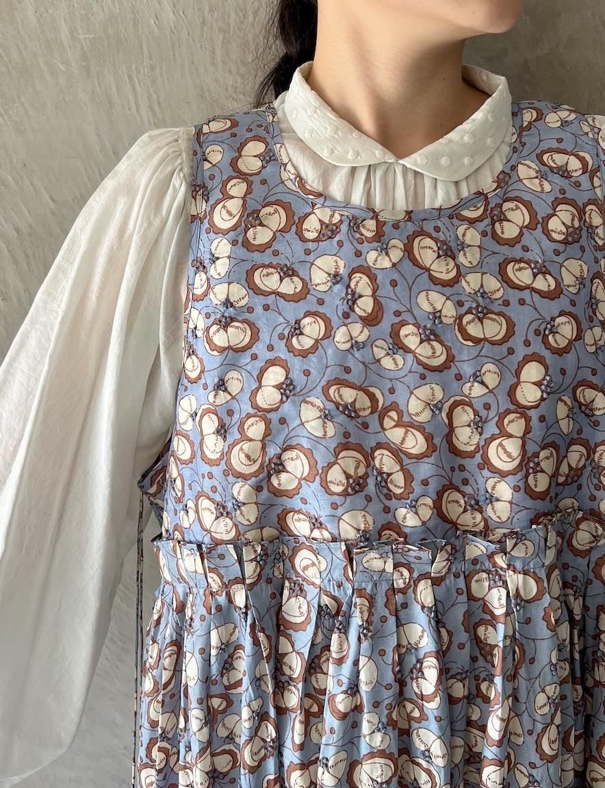 手織りのカディシルク100%の生地に、花模様のハンドプリントが施されたワンピース。