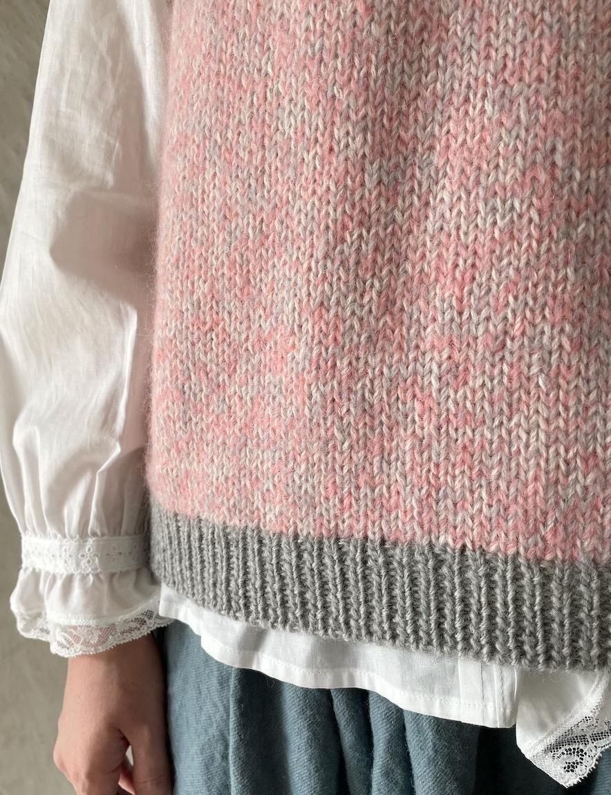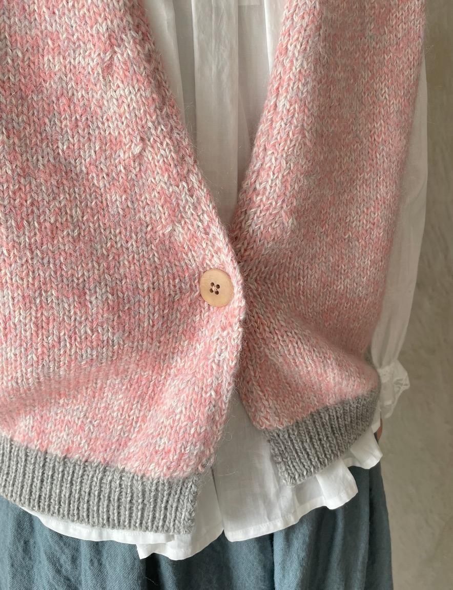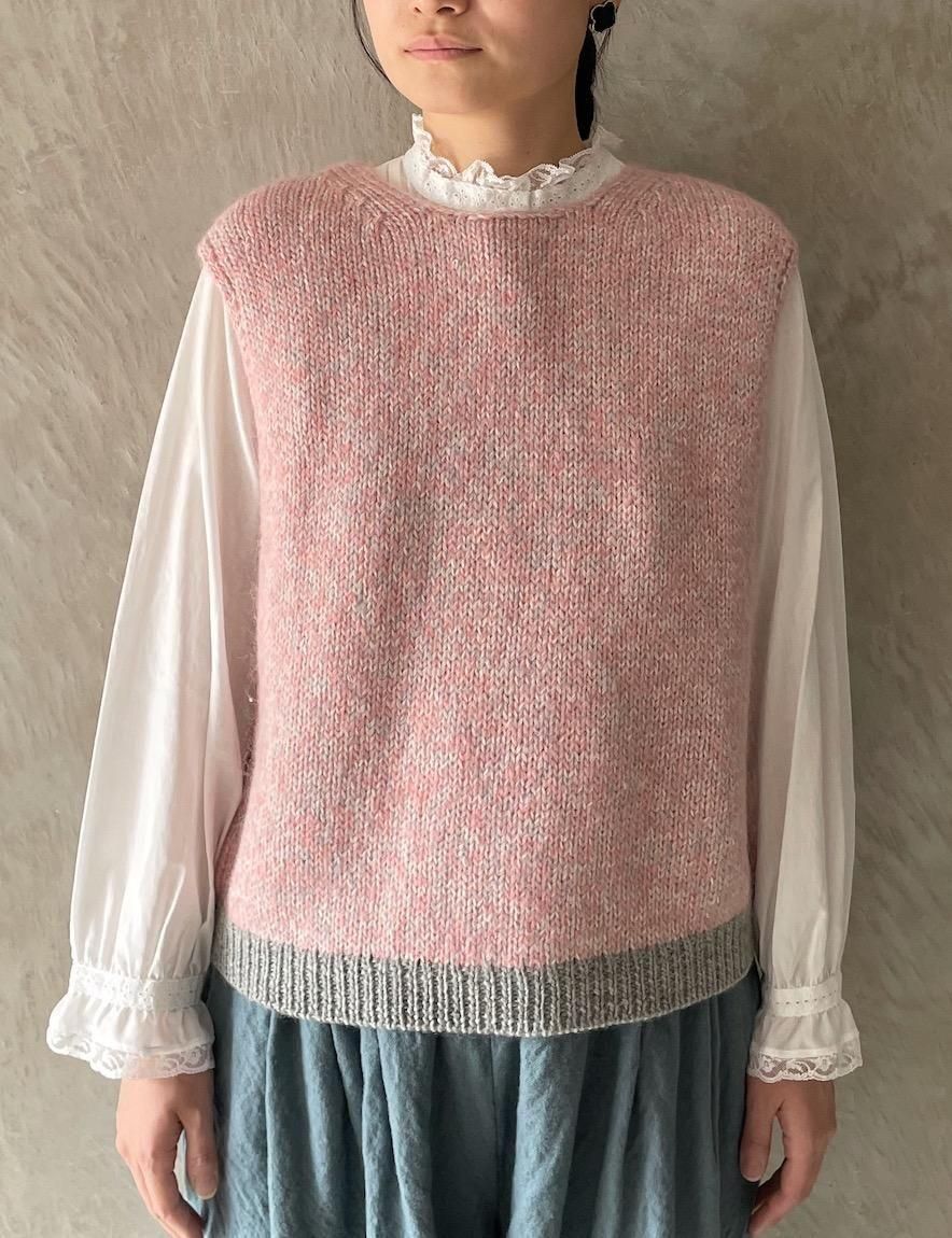 2種のベビーアルパカを3色に染めたオリジナルの撚り杢素材で編み上げたニット。