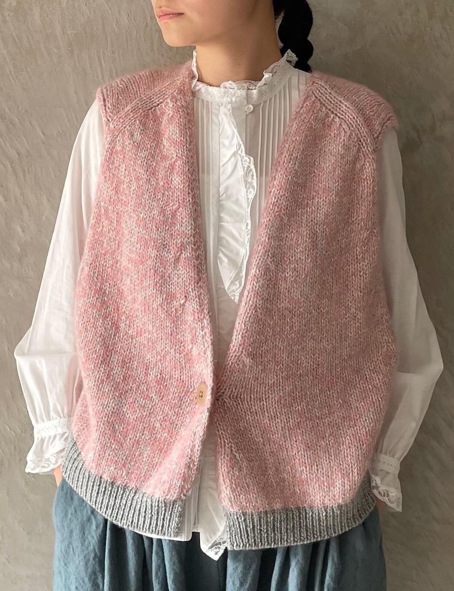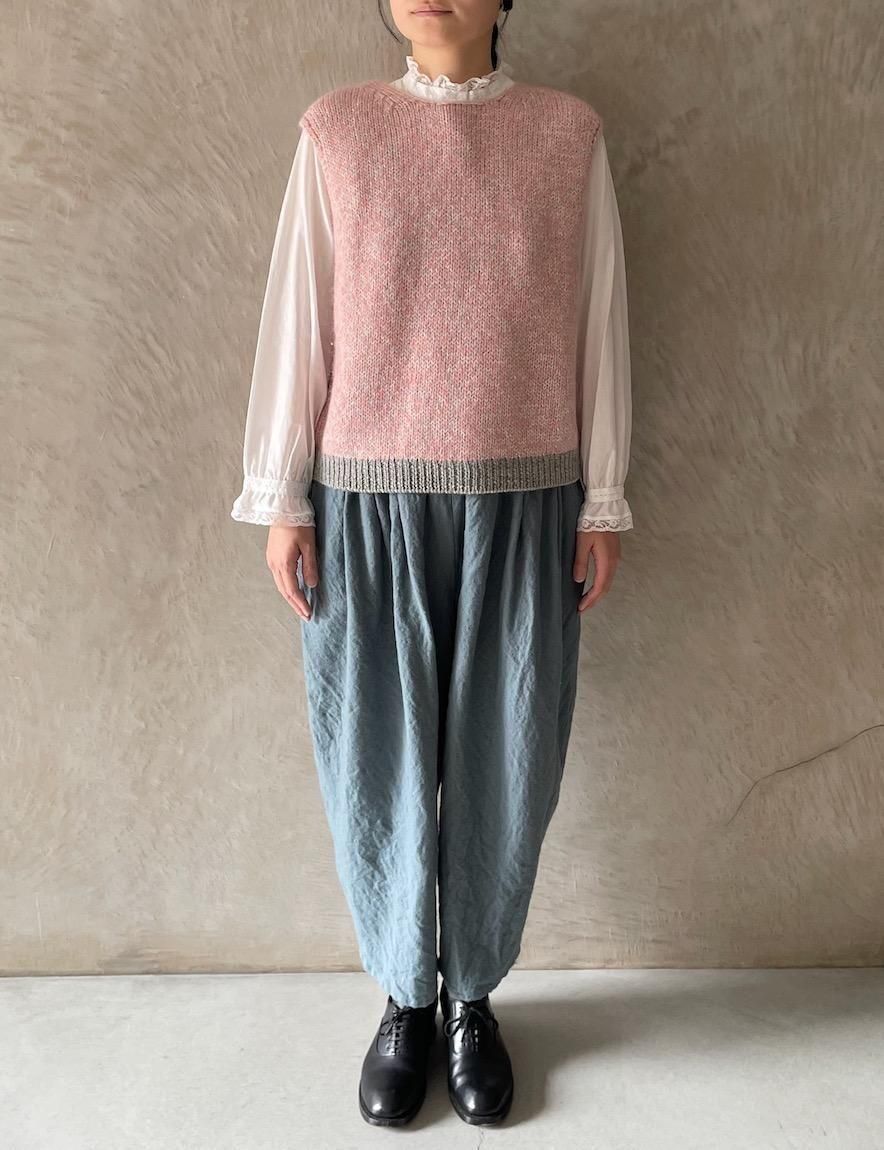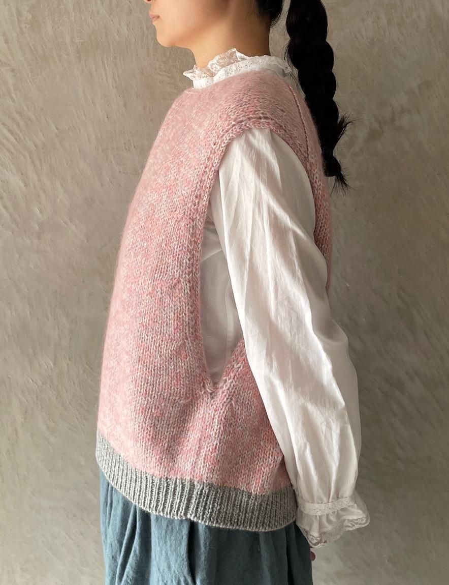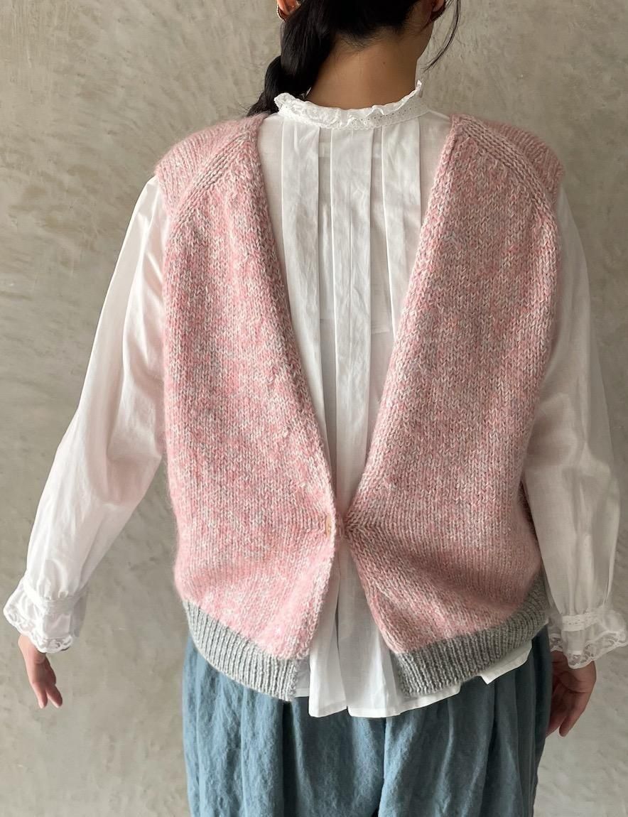 後ろにボタンが並ぶニットベスト。身巾やアームホールに余裕を持たせたデザインで、