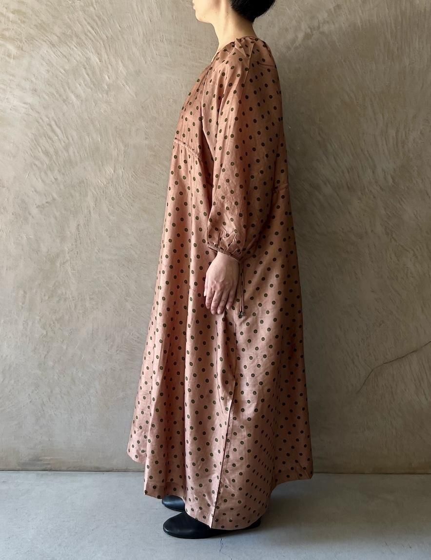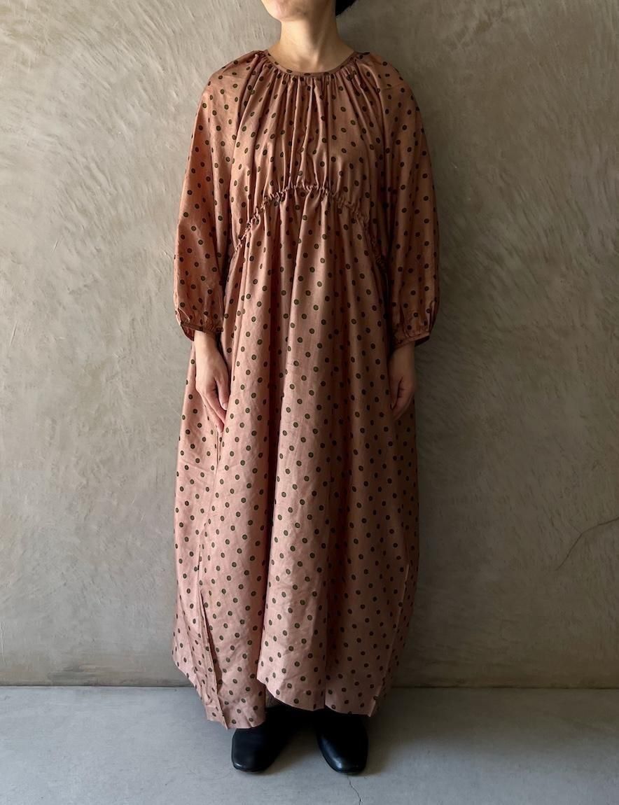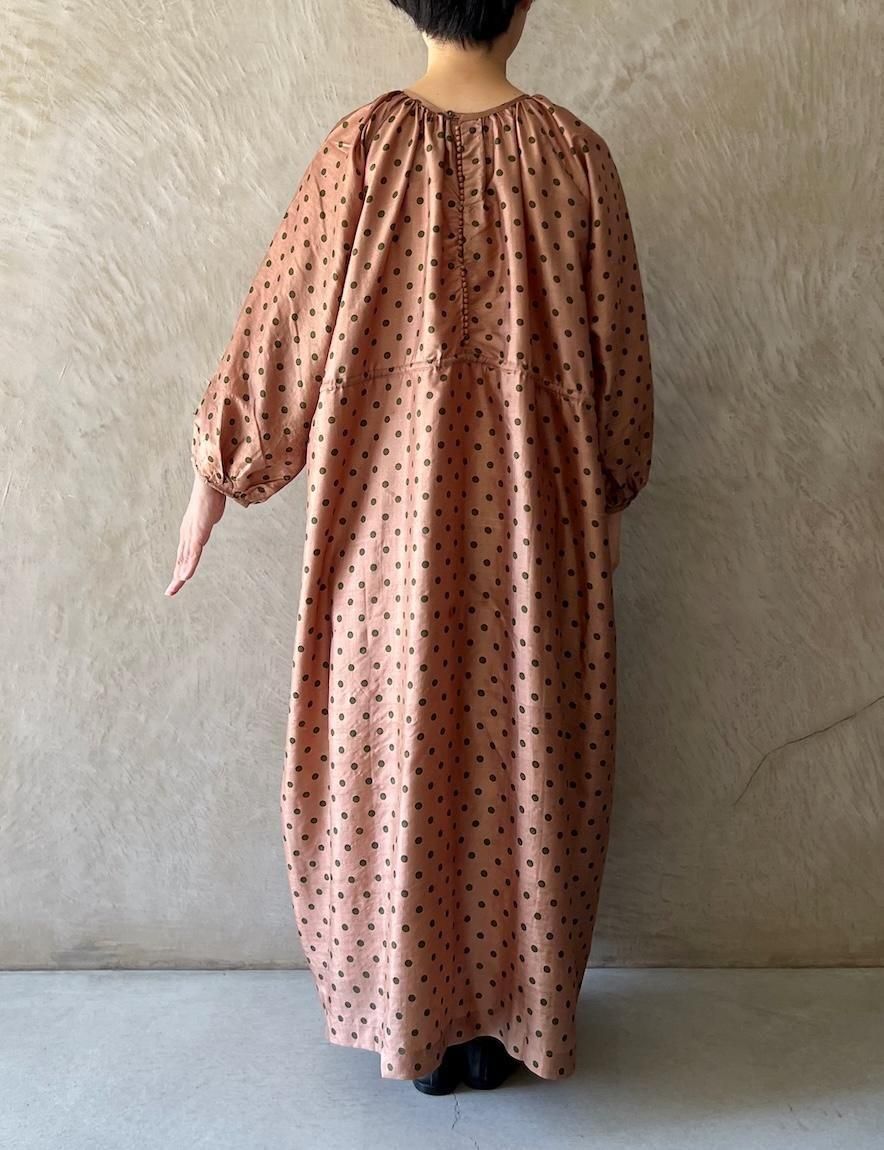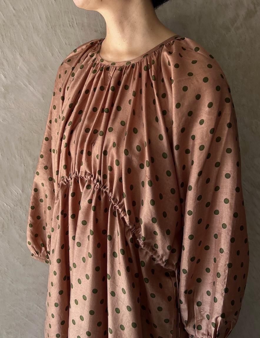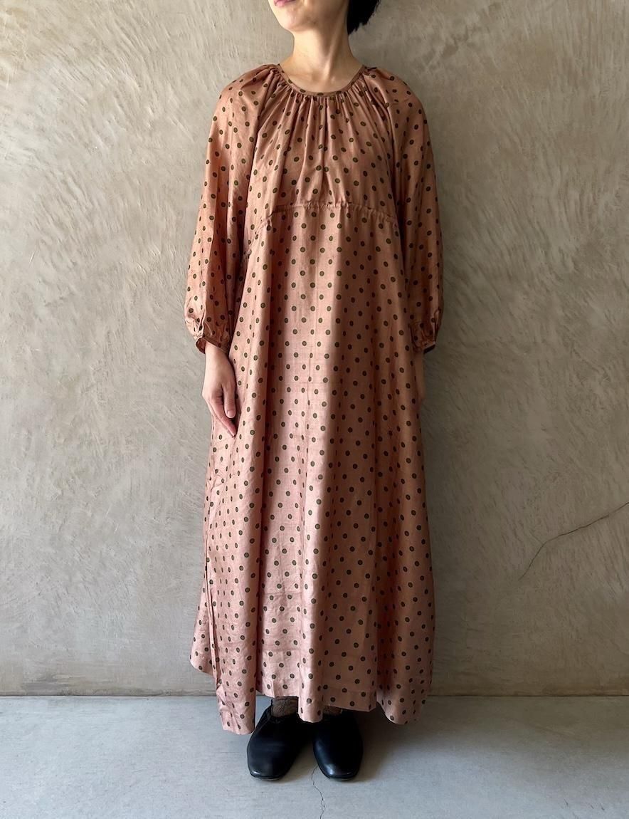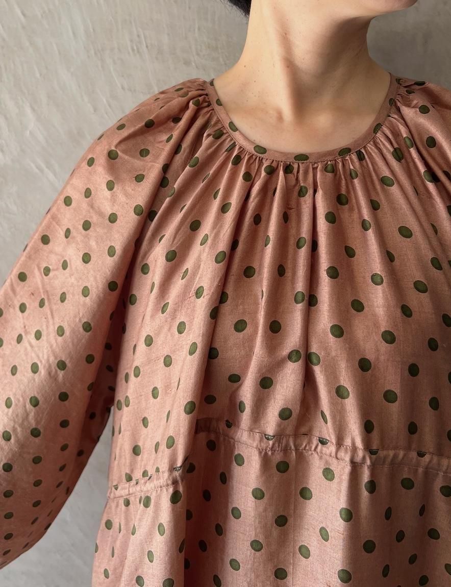 手織りのカディシルク100%の生地に、ハンドプリントが施されたドレス。