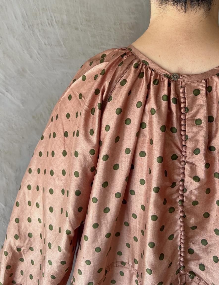 他にも、首元のギャザーや7分丈袖、ウエストのひもの先に付いた小さなボタンなど、