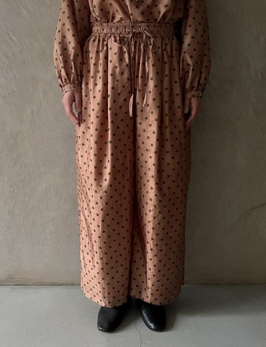手織りのカディシルク100%の生地に、ハンドプリントが施されたパンツ。