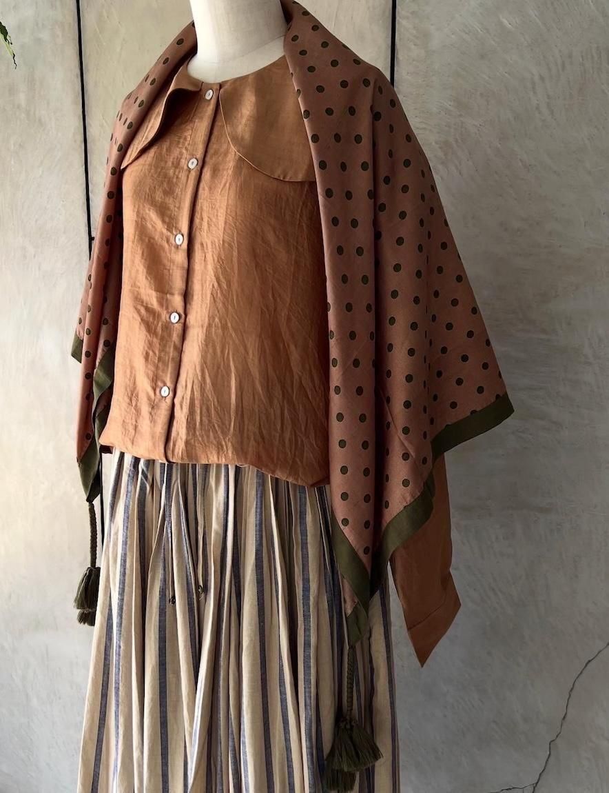手織りのカディシルク100%の生地に、ハンドプリントが施されたスカーフ。