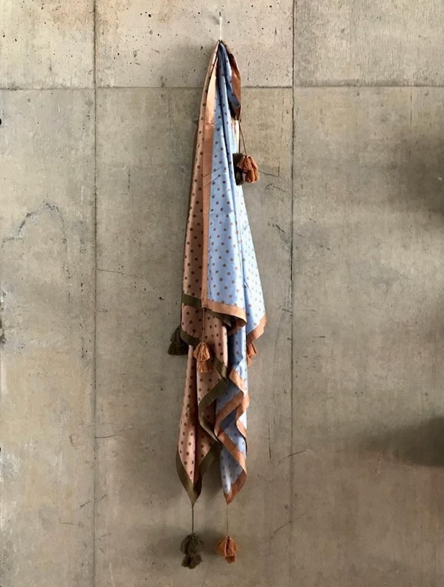 その四隅には大きめのタッセルがあしらわれ、巻いた時のアクセントになります。