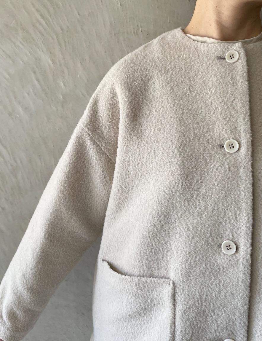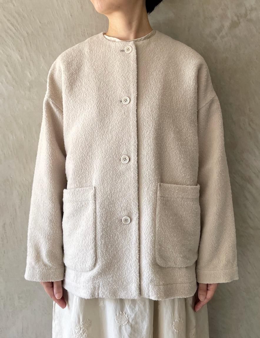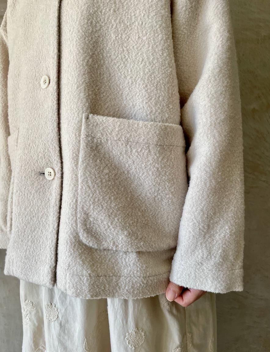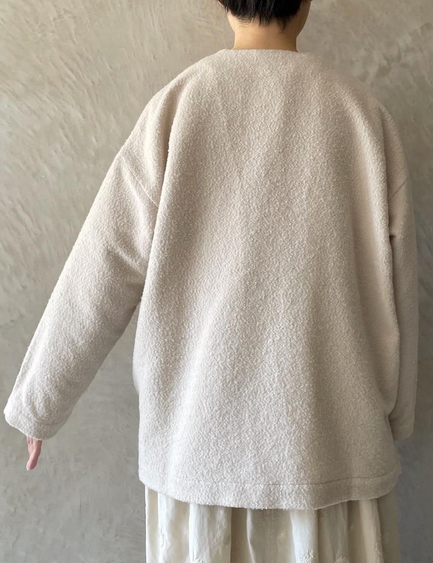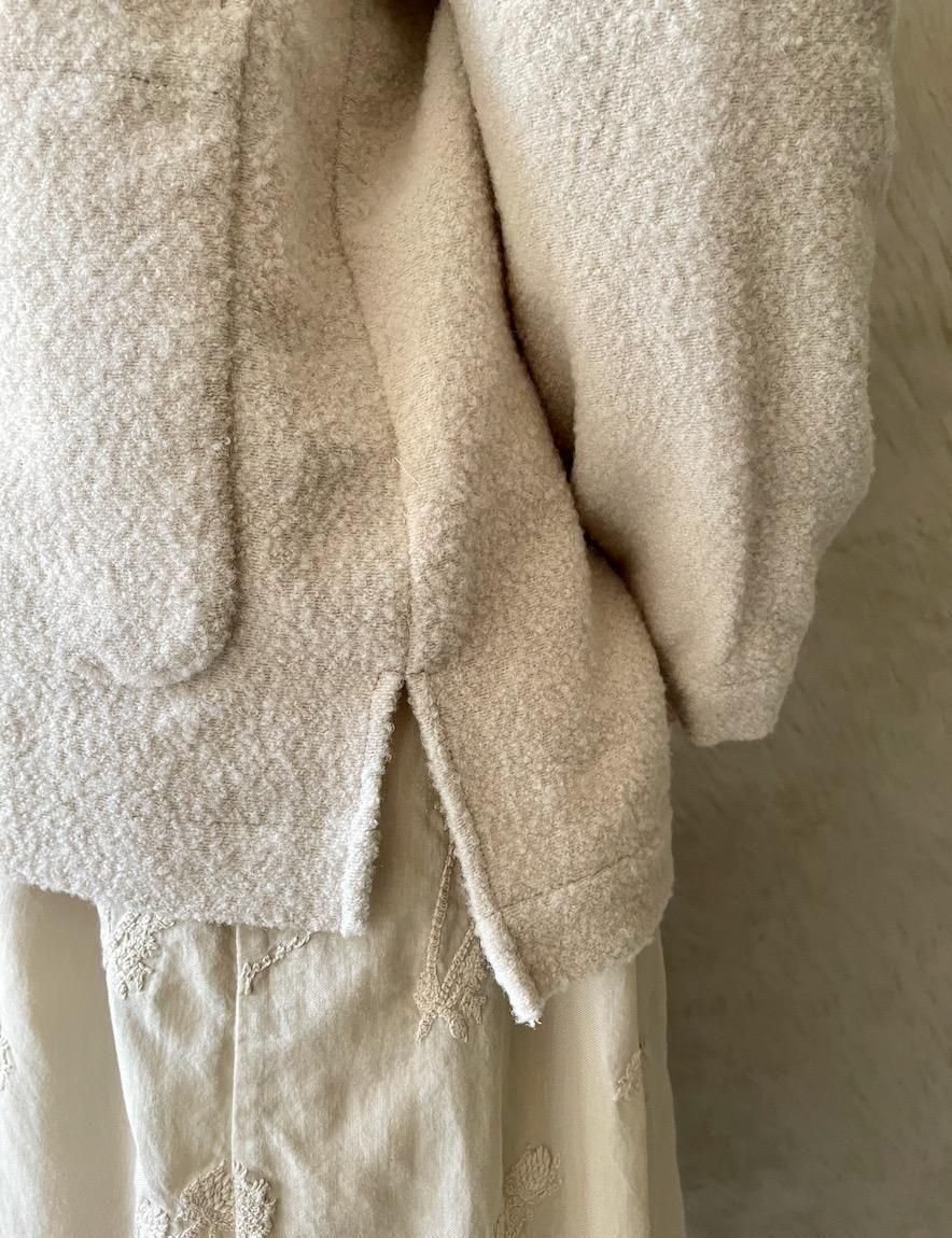 表には不規則的なループ状のウールブークレー糸を、裏にはコットン糸を使用した、