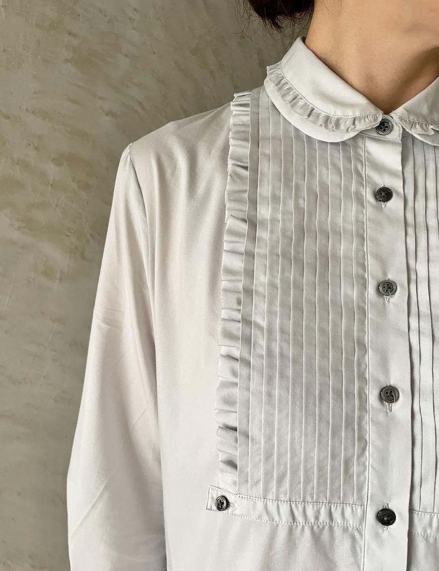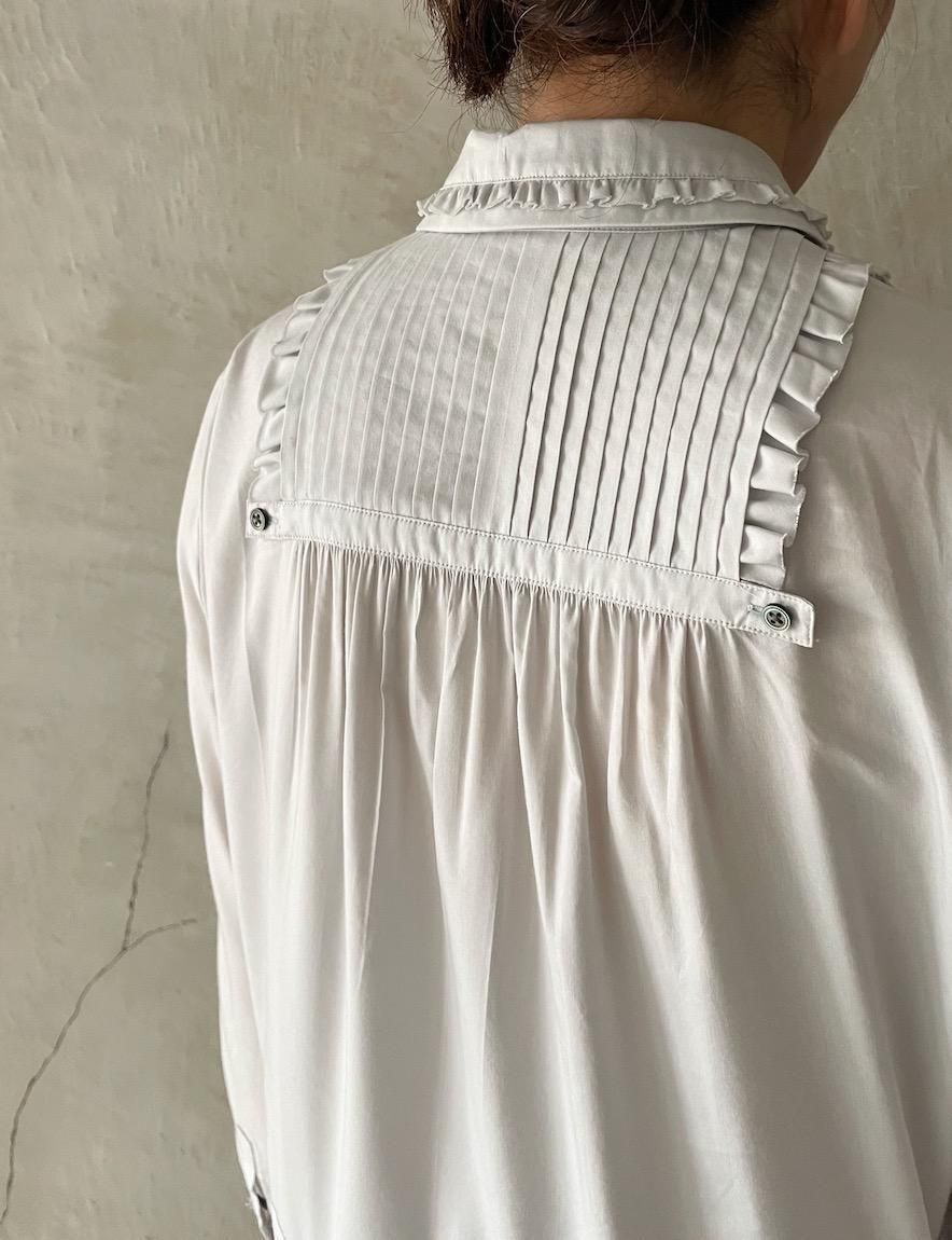細かなタックや襟や前後にあしらわれたフリル、裾部には梯子レースを施し、