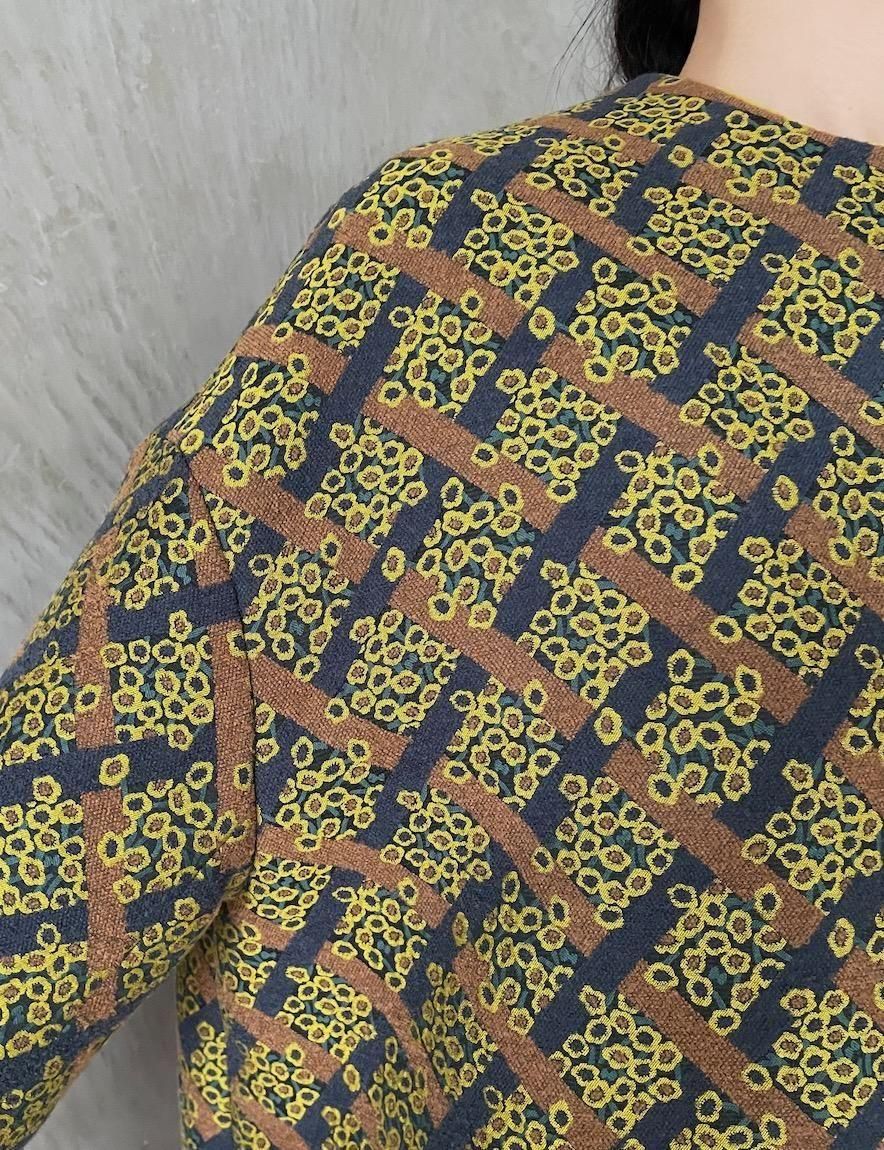 経糸にはシルク、チェック部分には細番手のブークレ糸、花の部分にはコットン糸を使用した、