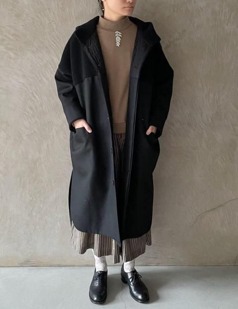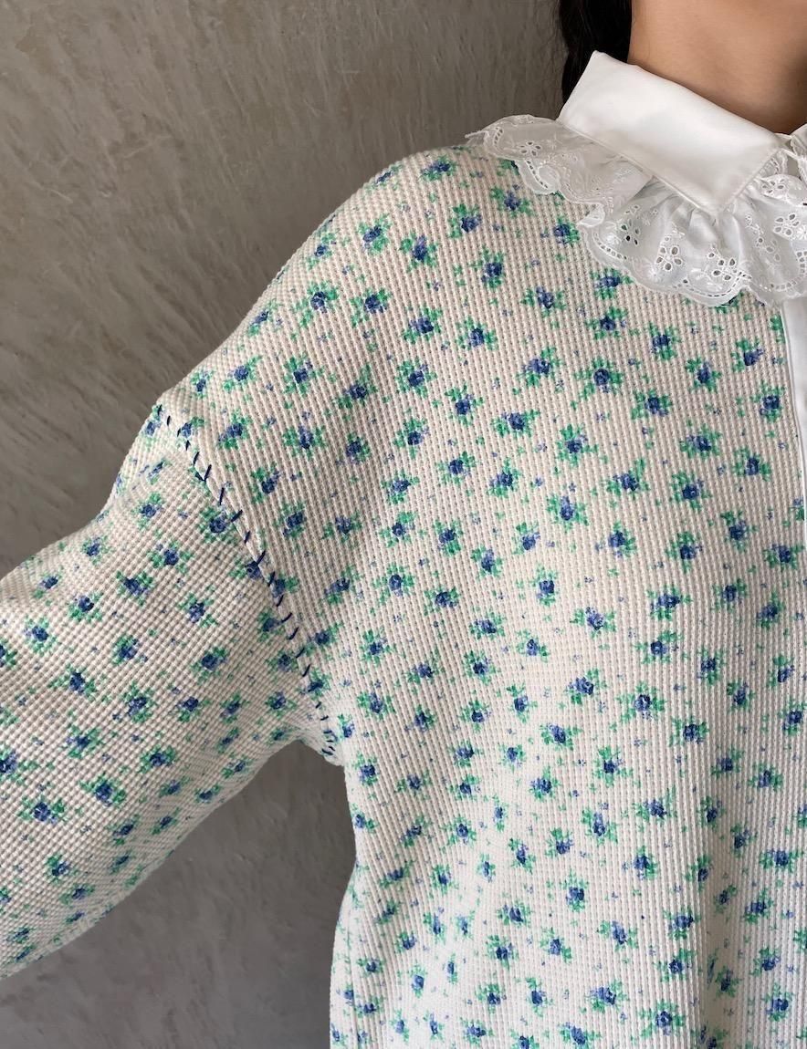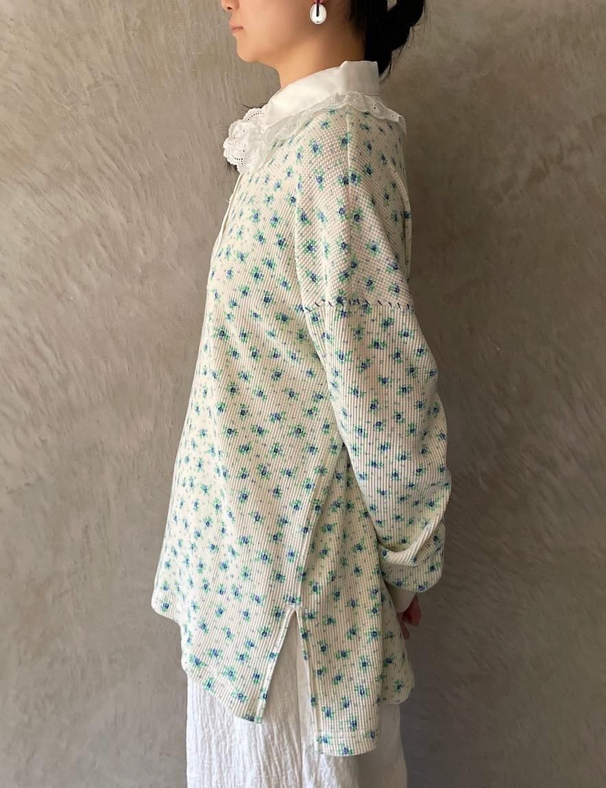 裾にスリット入り。貝のボタンにはお花のレリーフ。