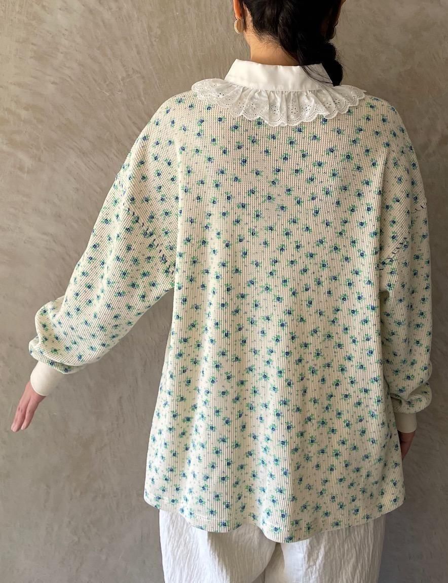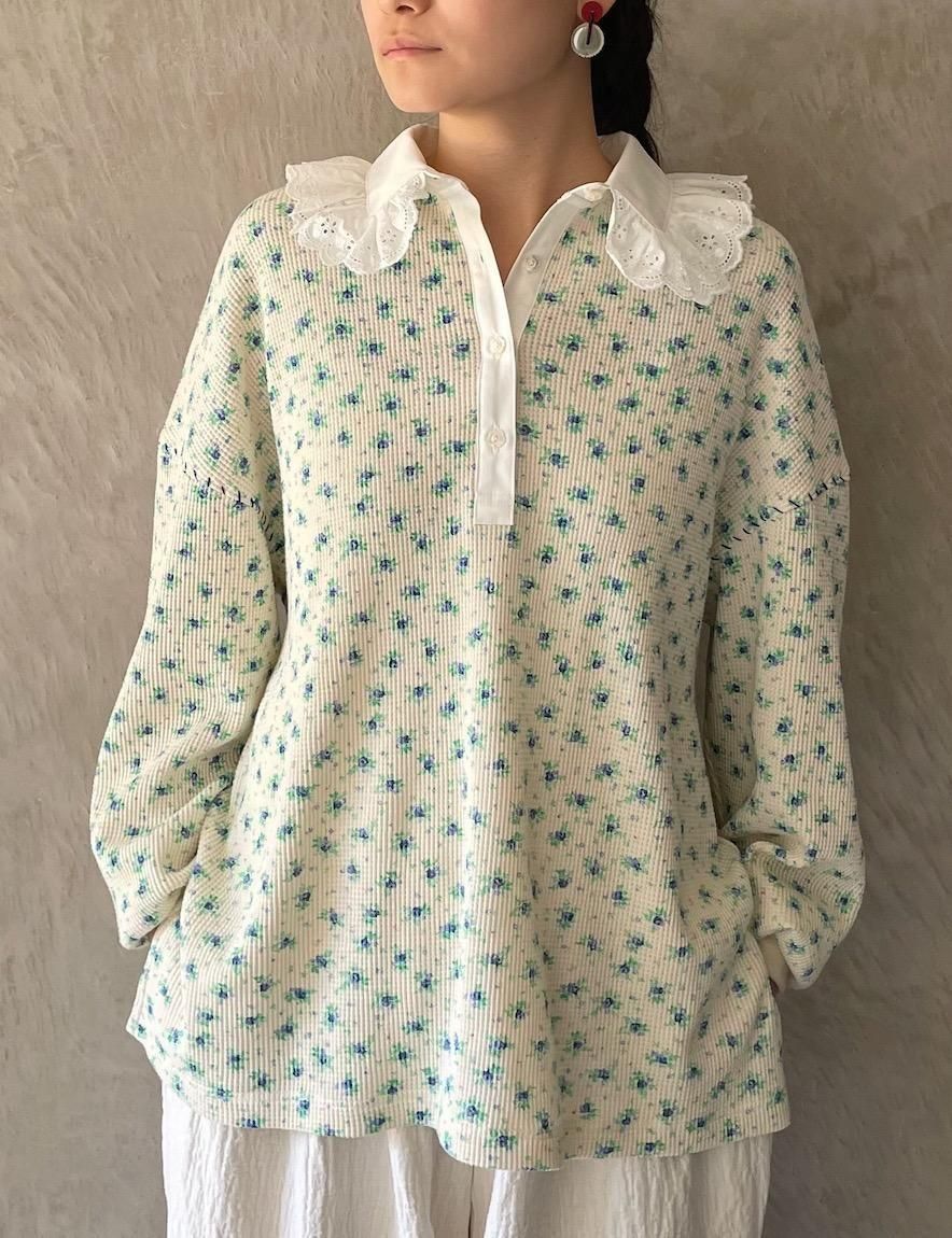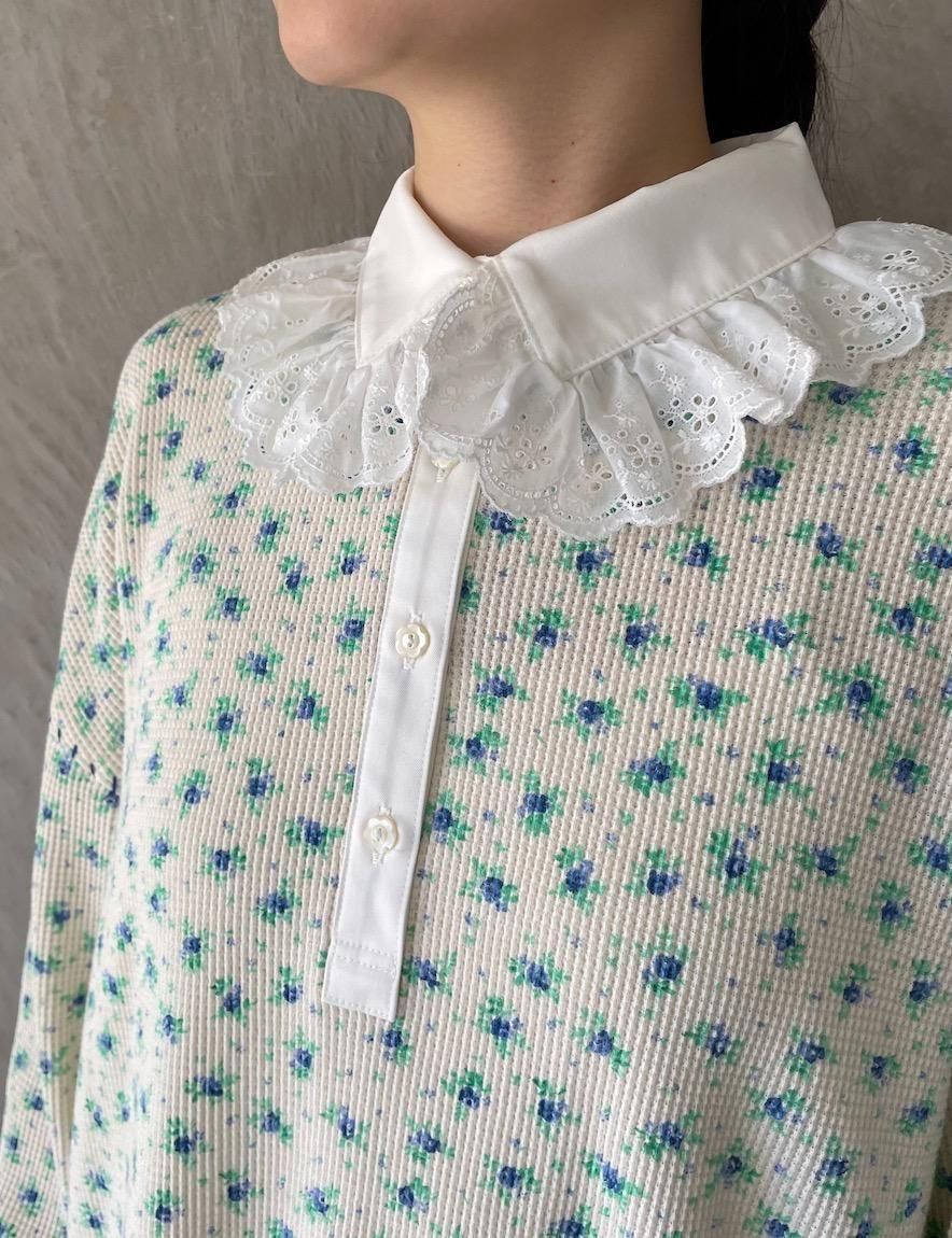 しっかりと硬めの襟をたっぷりのコットンレースで縁取っています。