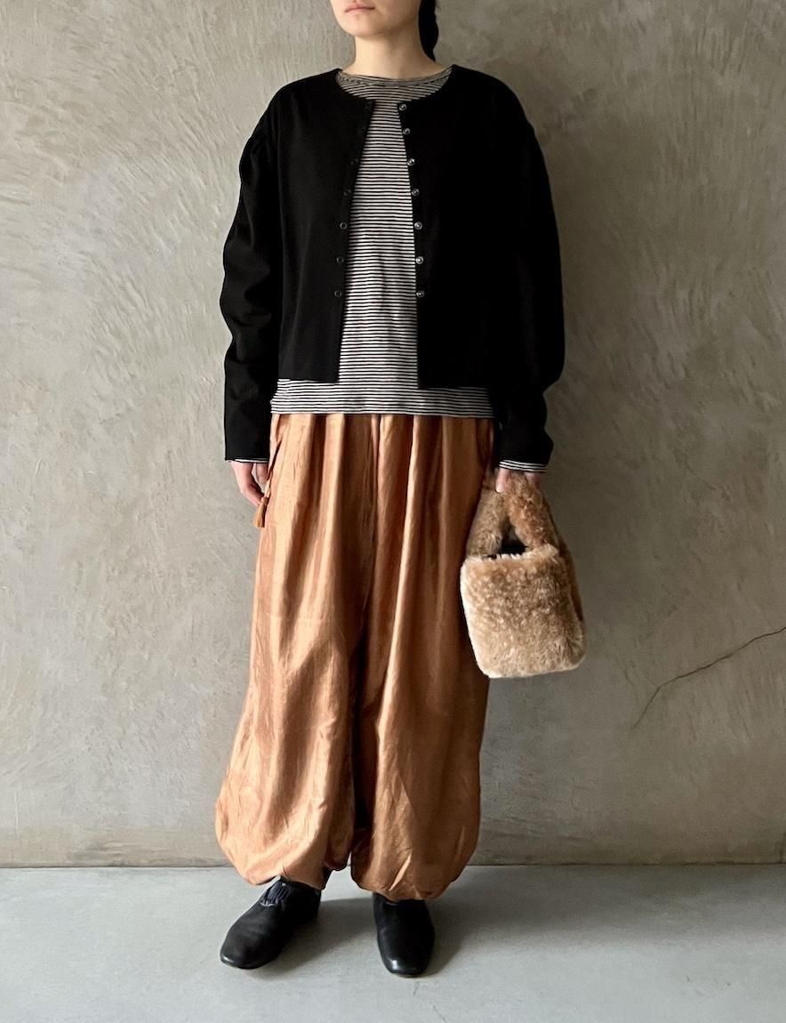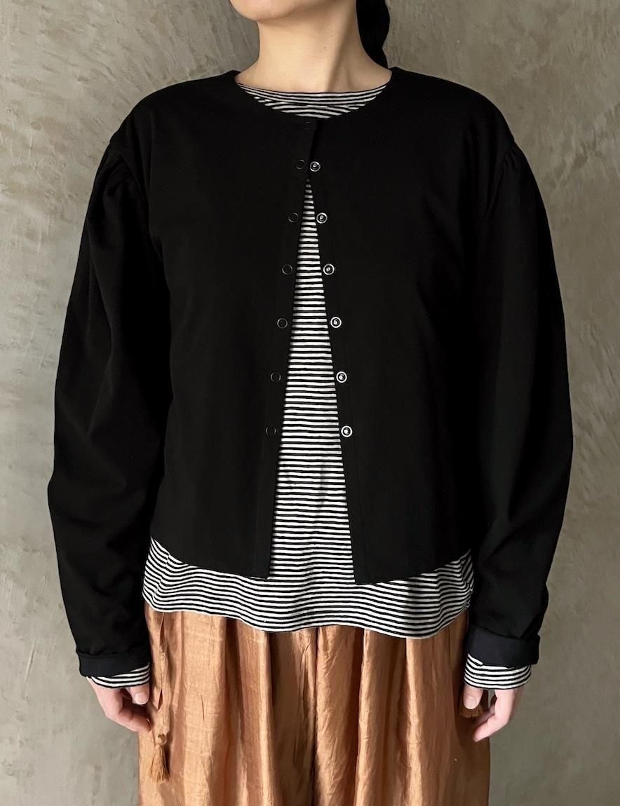 40ゲージでしっかりと編んだ裏毛のカットソー素材を表地に使用したカーディガン。