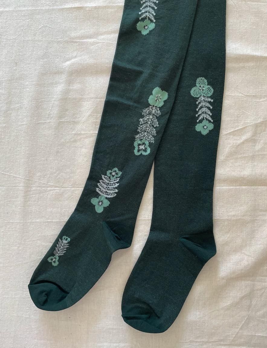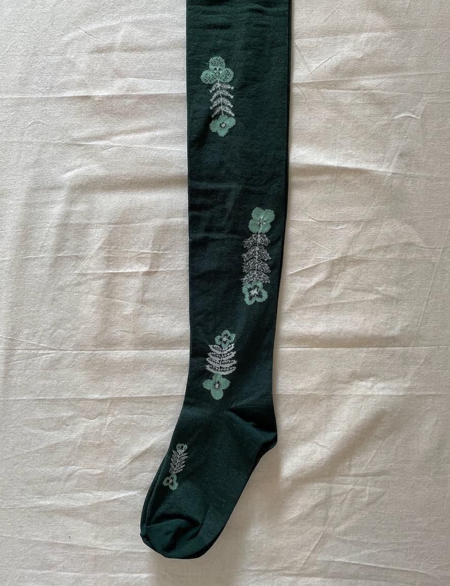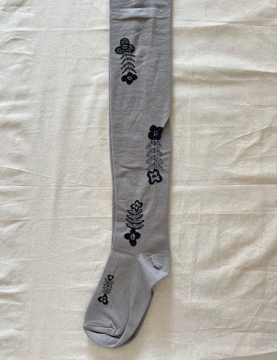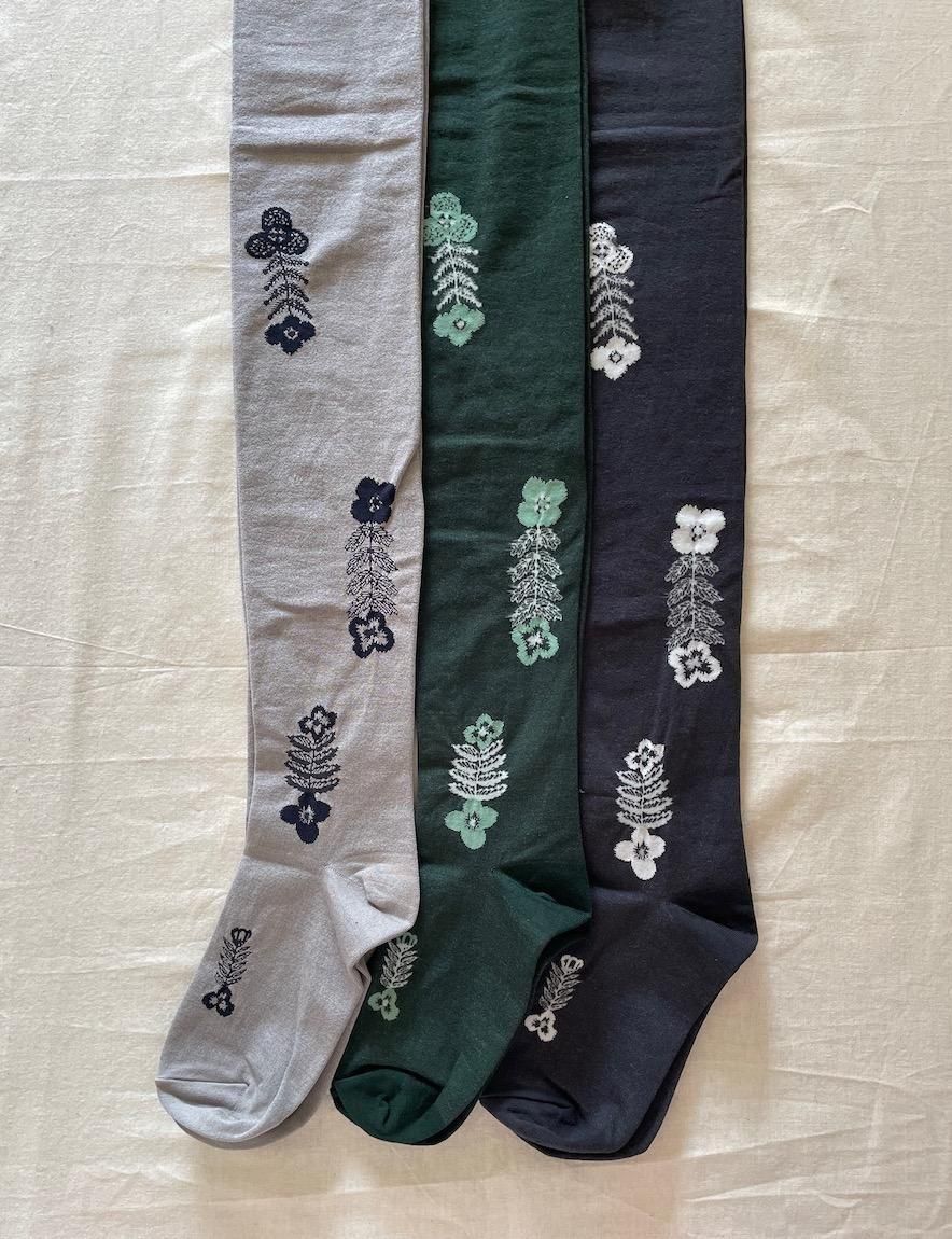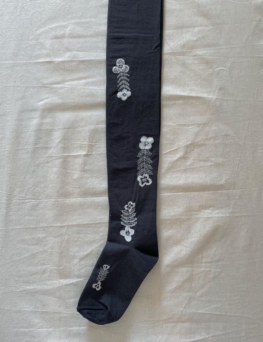 図案に描かれた満開の花々がそれぞれ浮かび上がるように編み柄でデザインされたタイツです。