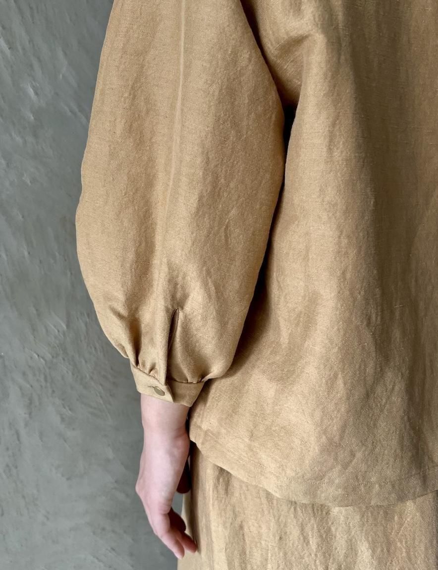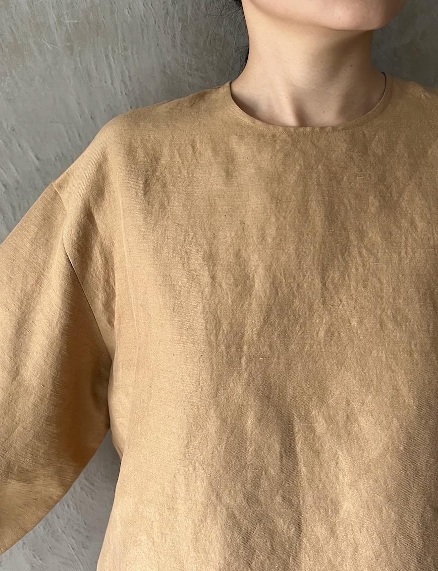 素材は、縦に中太番手シルク、横に中太番手のリネン糸で密度を甘めに織ったリネンシルク。