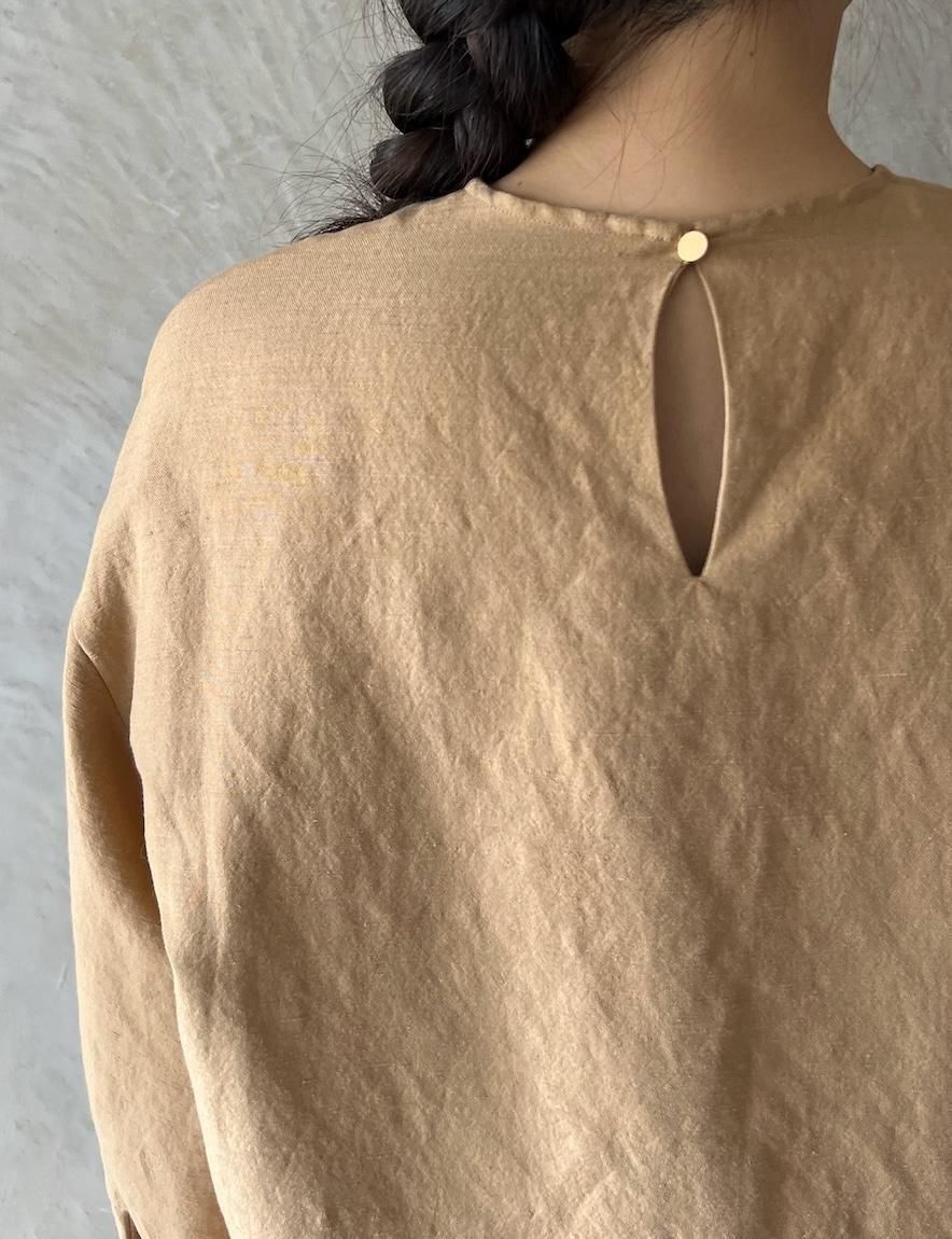 後ろネックポイントに一つだけ添えた金色のボタンが、アクセサリーのように小さな煌めきを添えています。