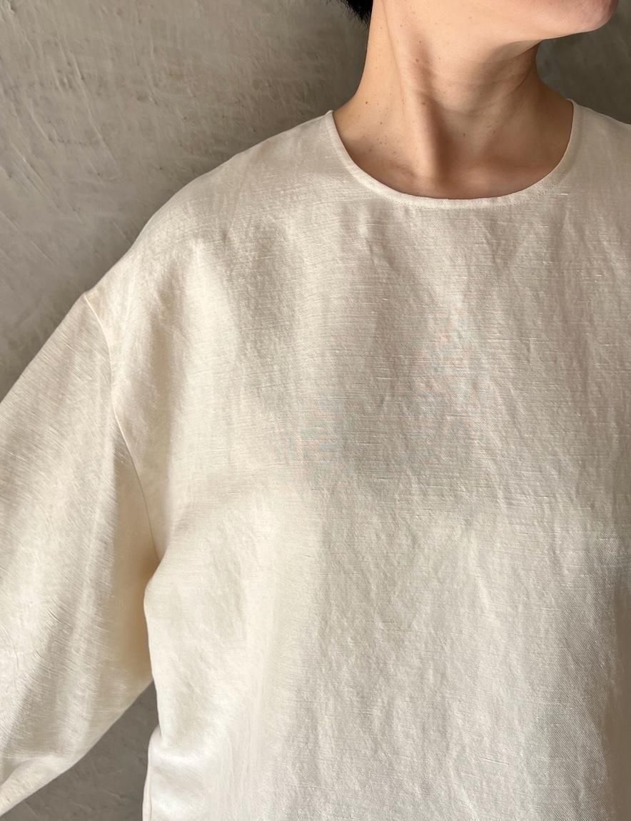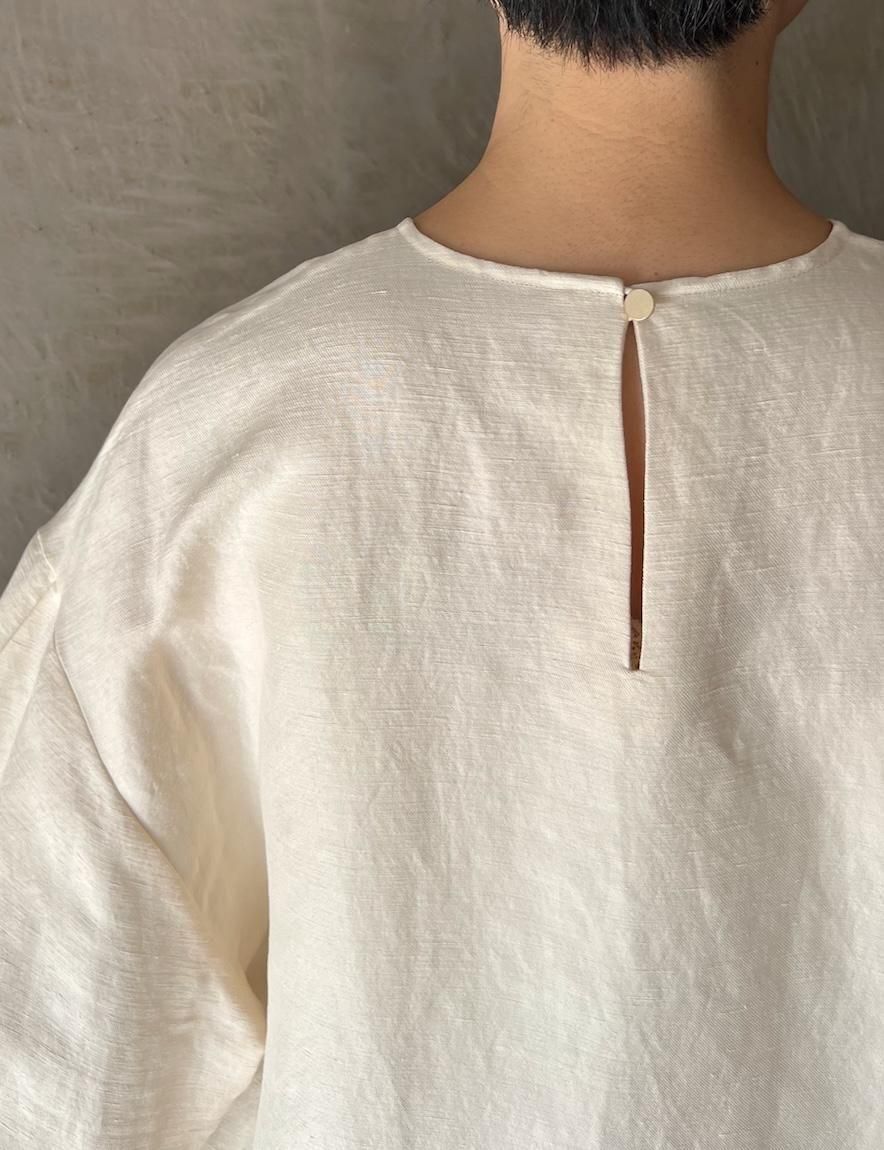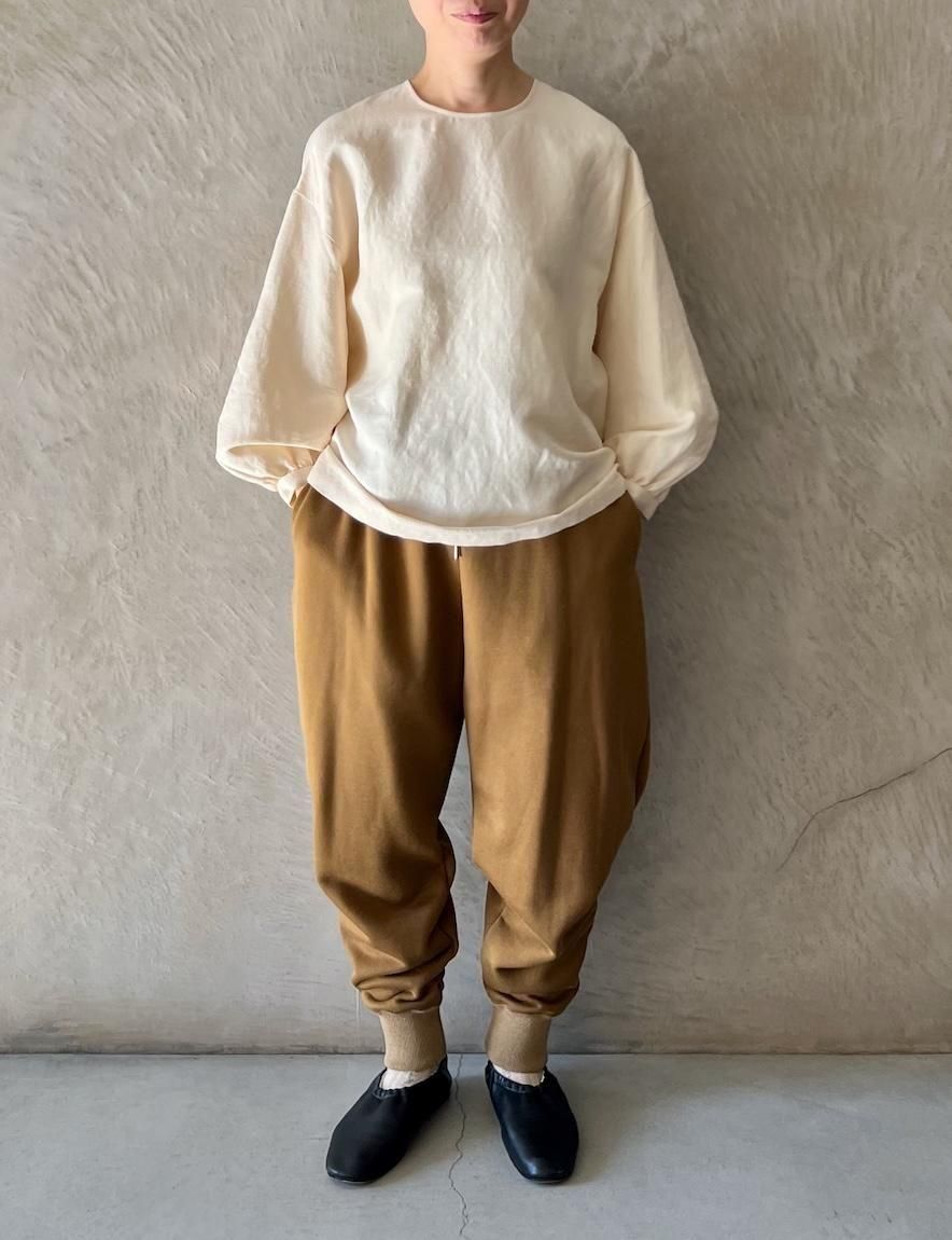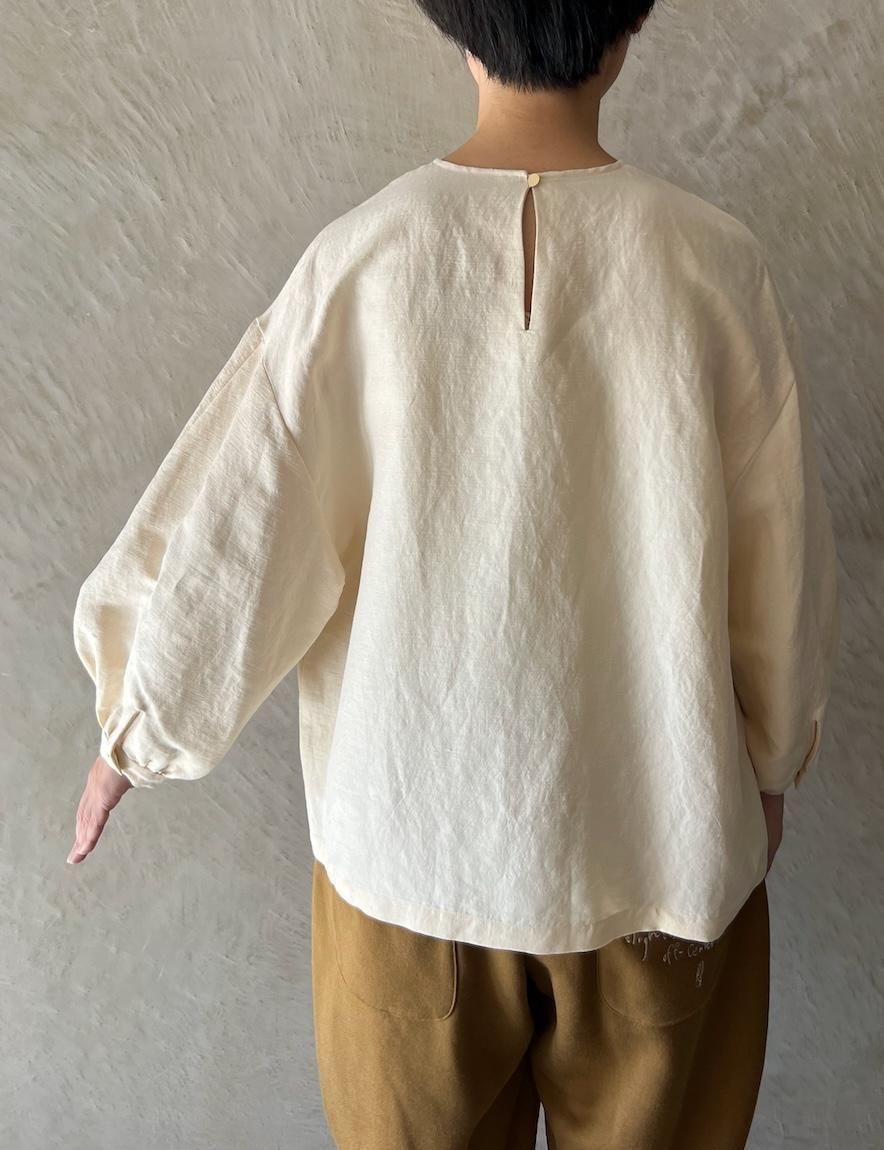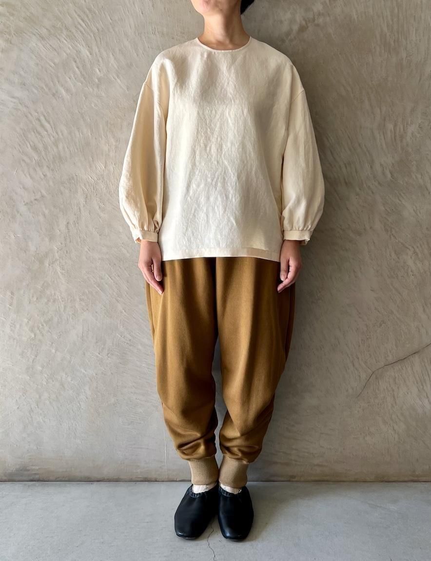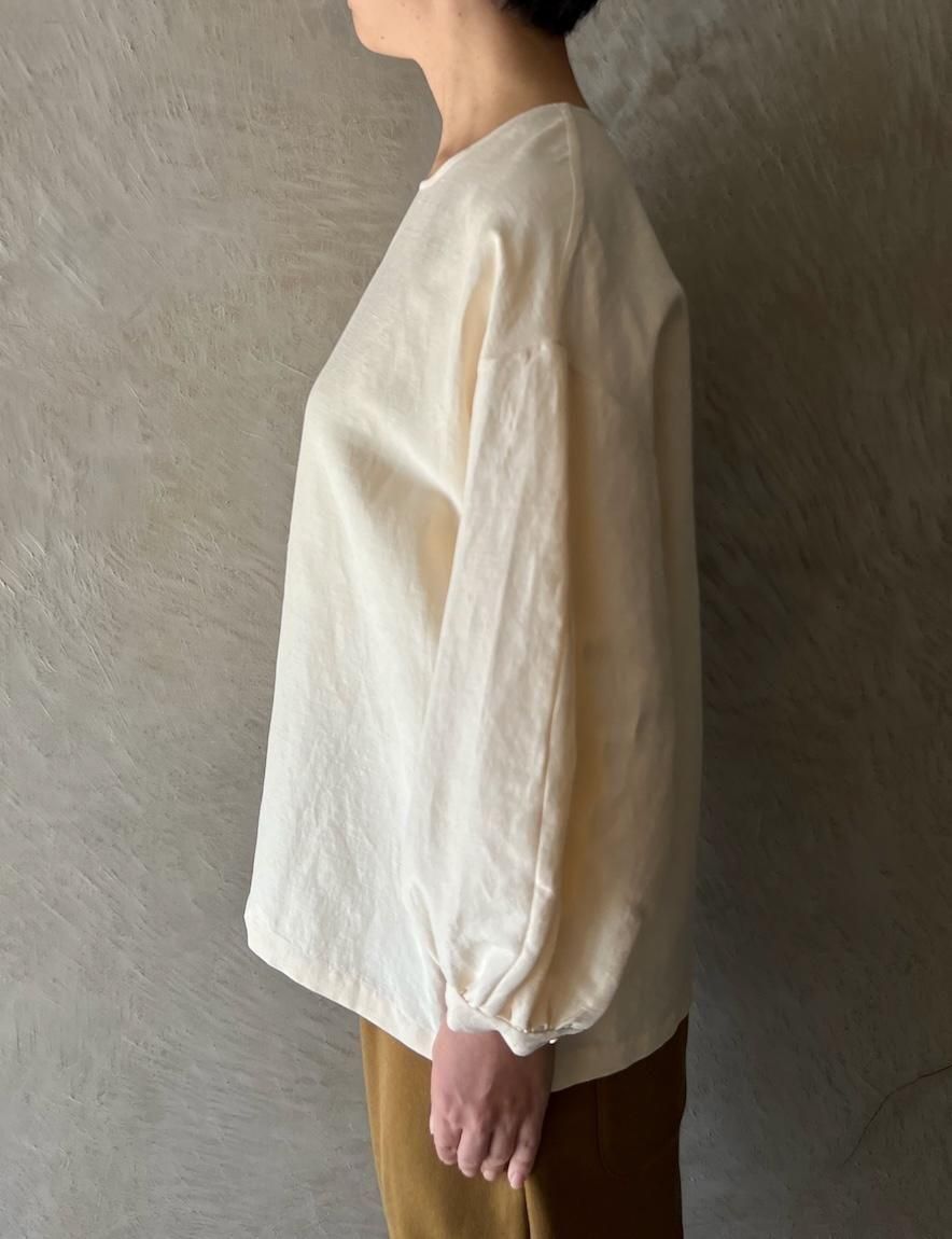 豊かなパフスリーブとすっきりと静かな首元の対比が印象的なpuff sleeve pullover。