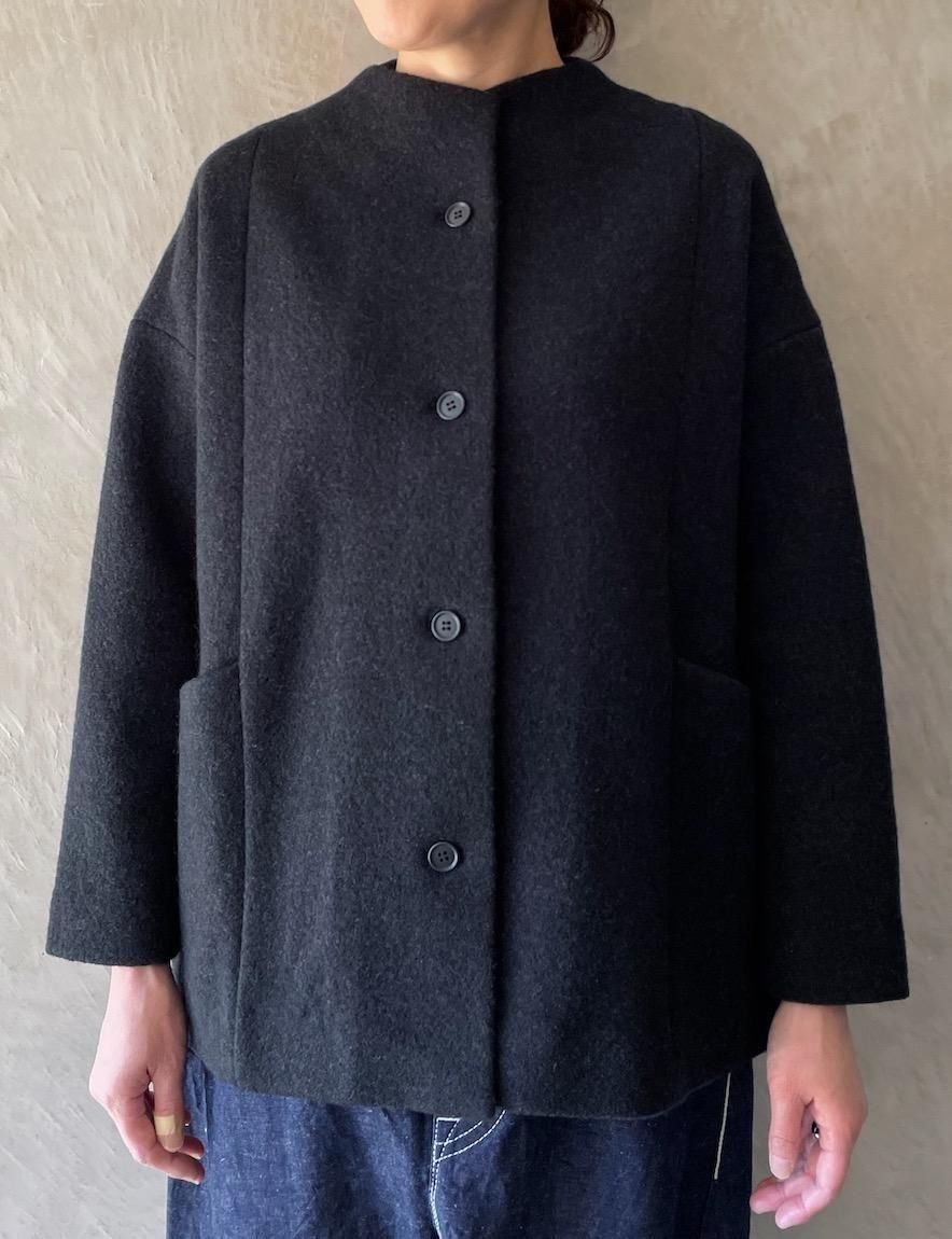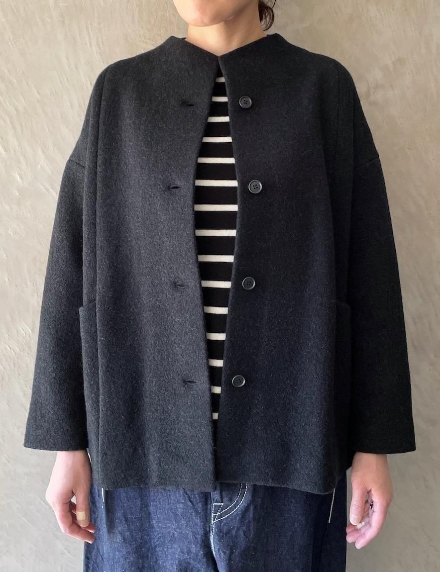 少し立ち上がったネックラインが上品な印象のショートコート。