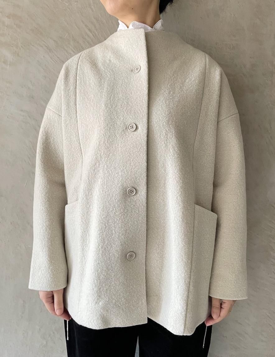 少し立ち上がったネックラインが上品な印象のショートコート。