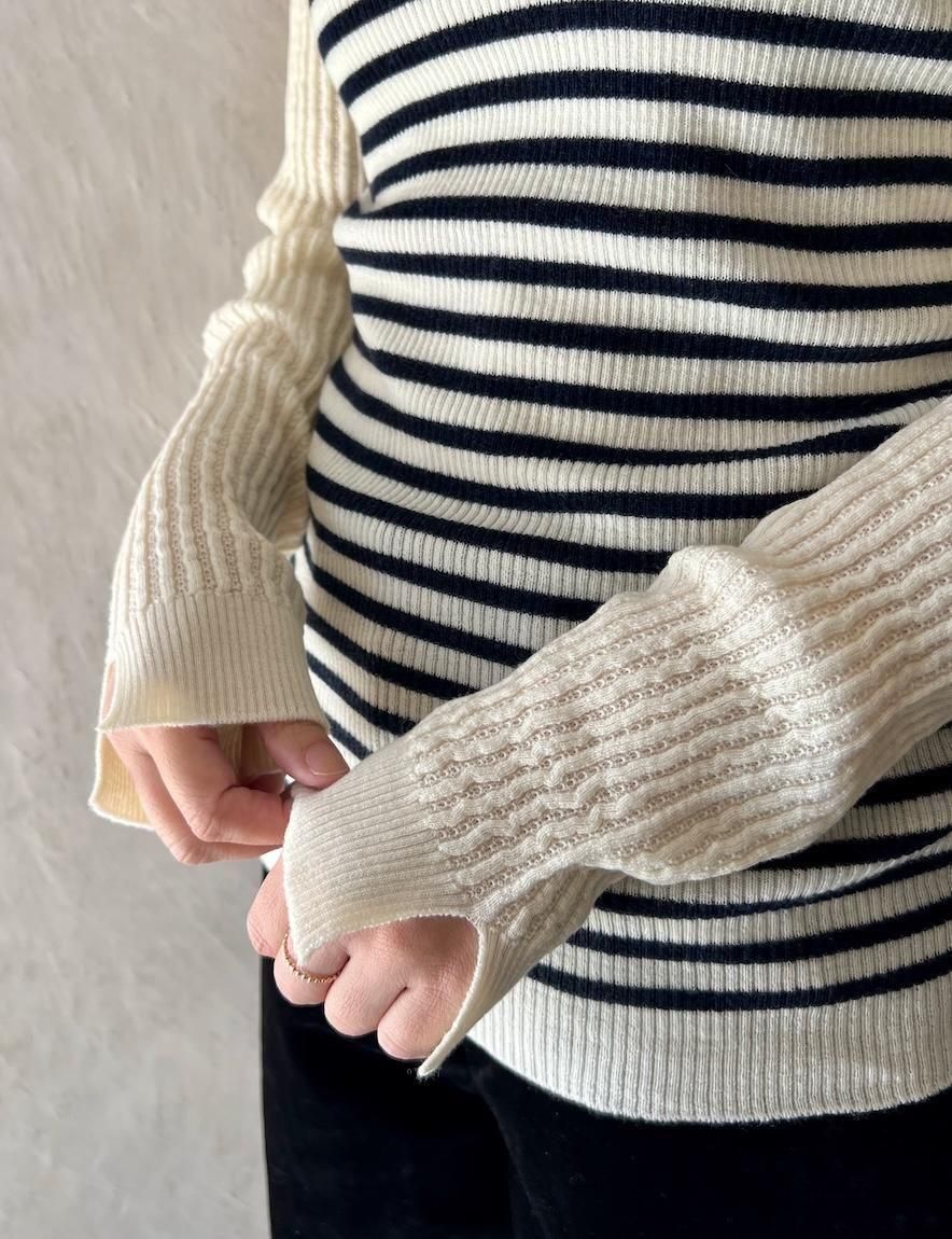 胸元と袖の編み地は変形リブ編み。バスト下の身頃とタートル部分はプレーンな天竺編み。