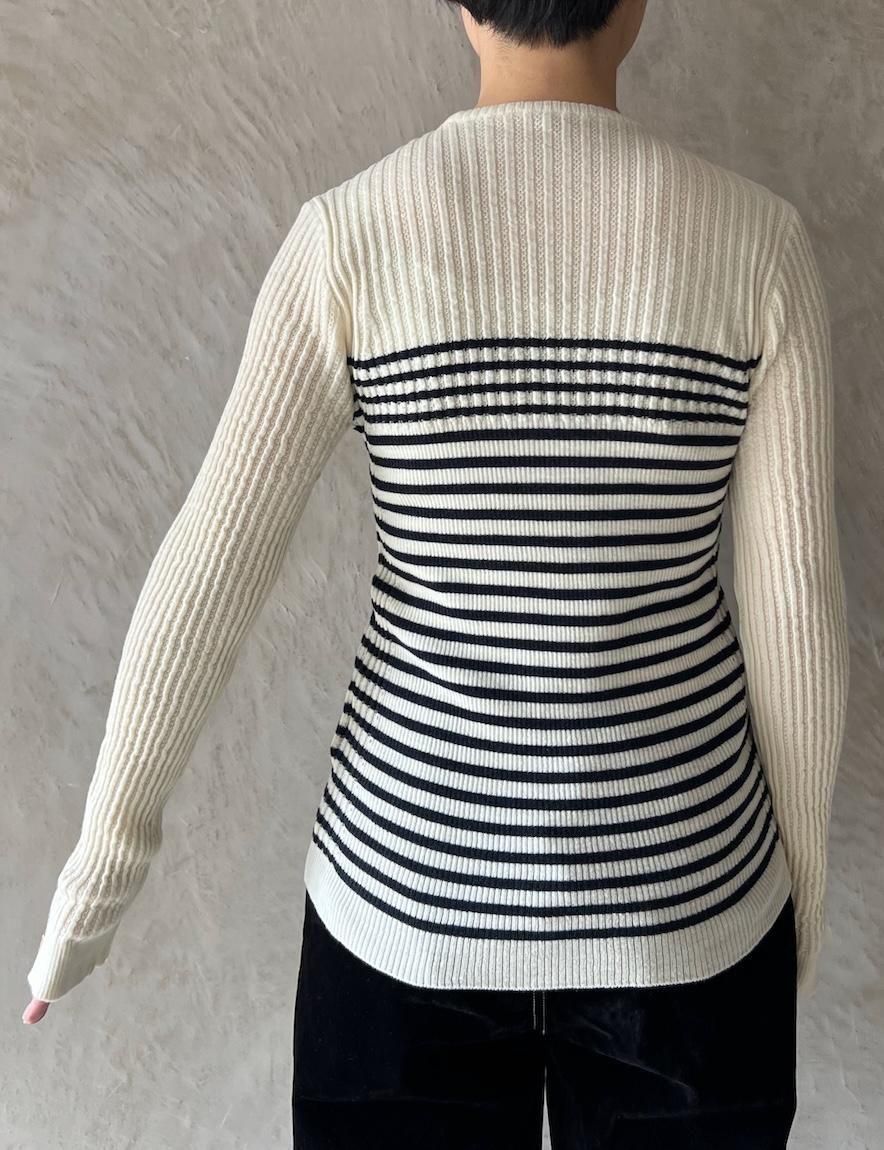 胸元から編み地を切り替えて、シンプルな中にもコントラストをつけています。