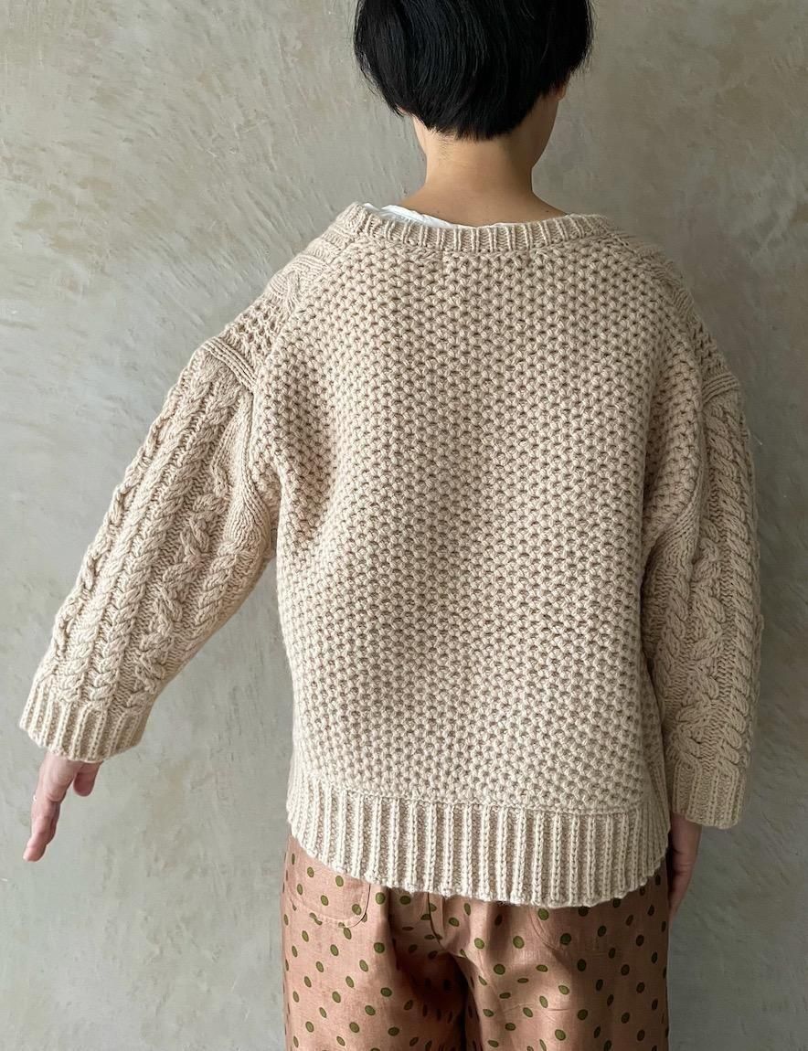 前身頃と袖にはケーブルとハニカム模様を組み合わせ、存在感のあるデザインに。