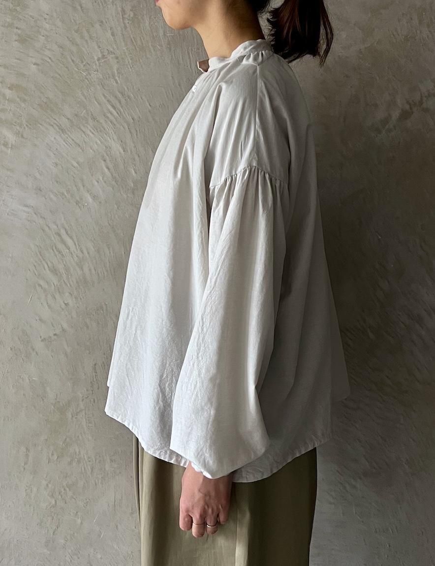 襟元と袖口に寄せたたっぷりのギャザーが、ブラウスに程よい甘さを添えています。