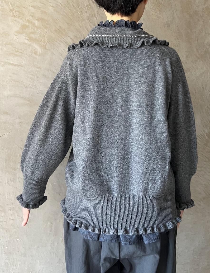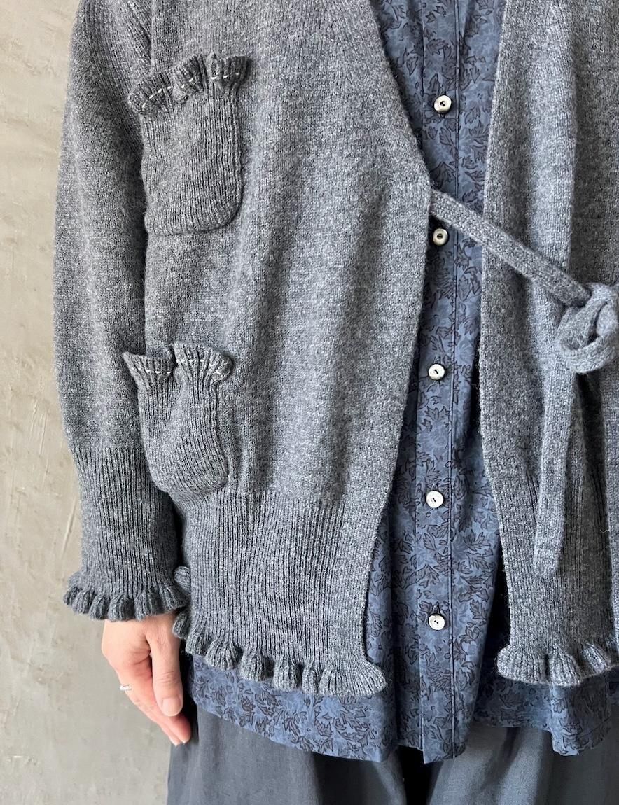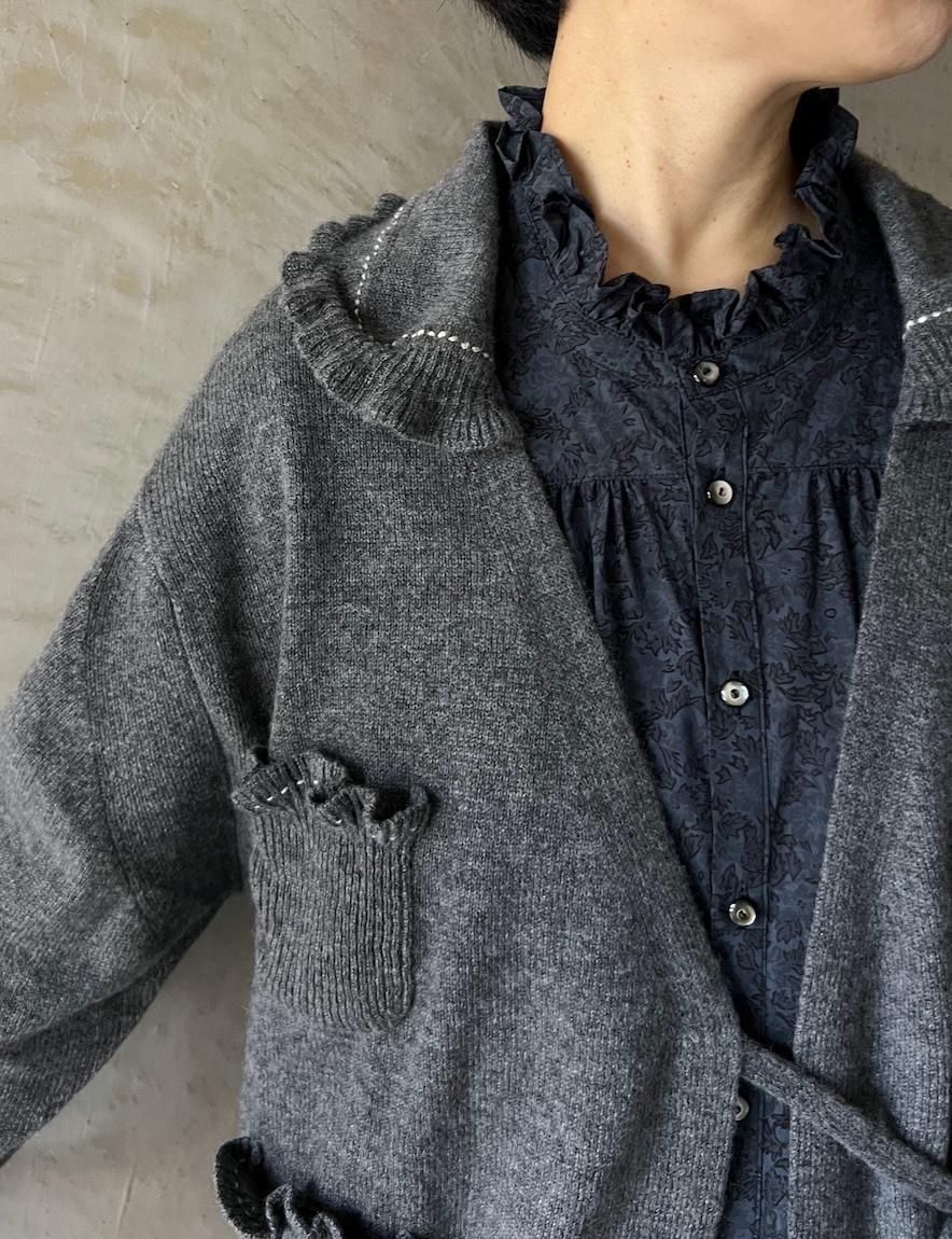 首元、袖口、裾、そしてポケット部分に、ぽこぽこと膨らんだようなフリルが編まれて、