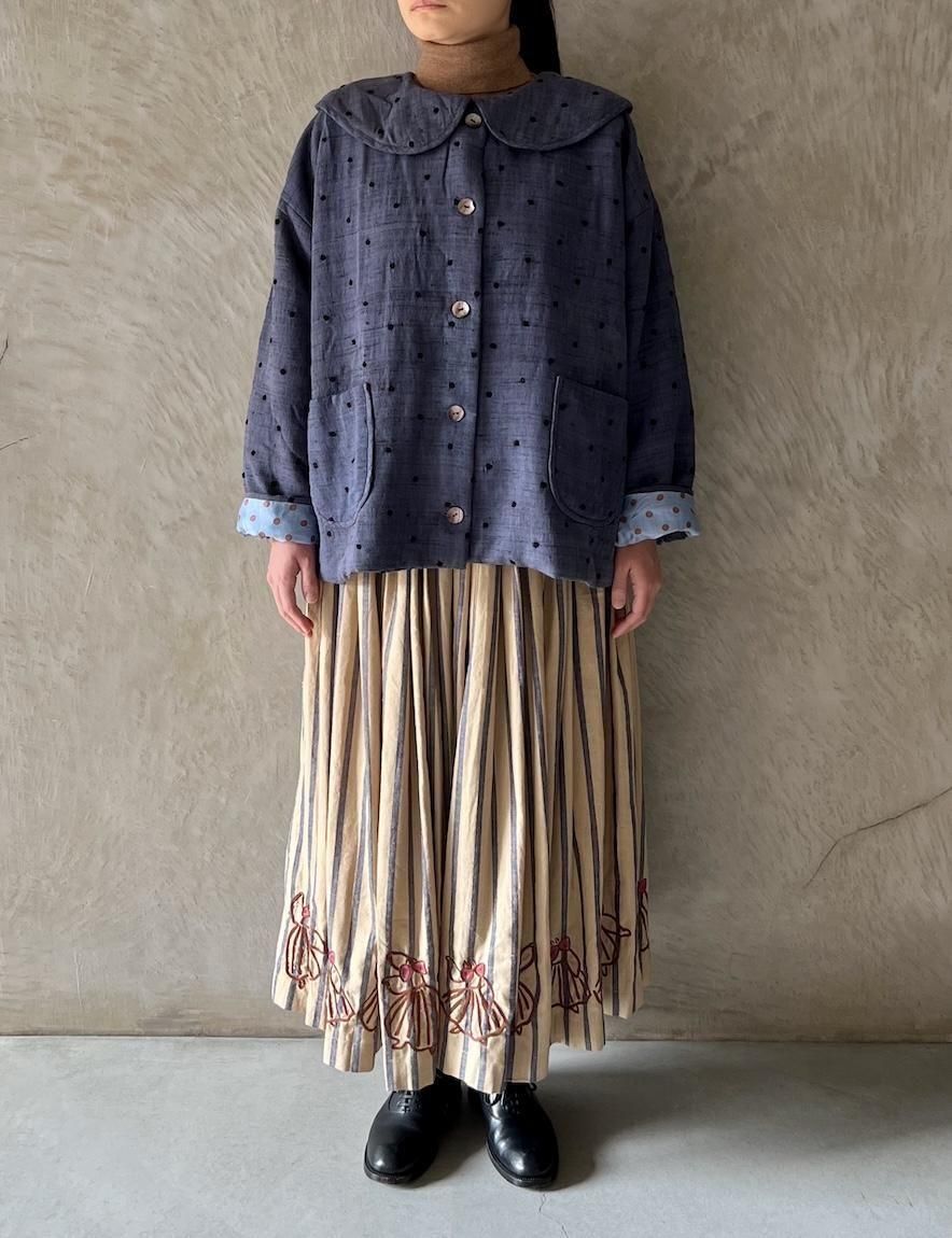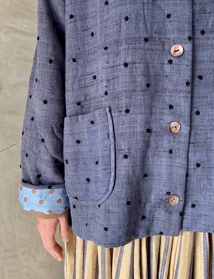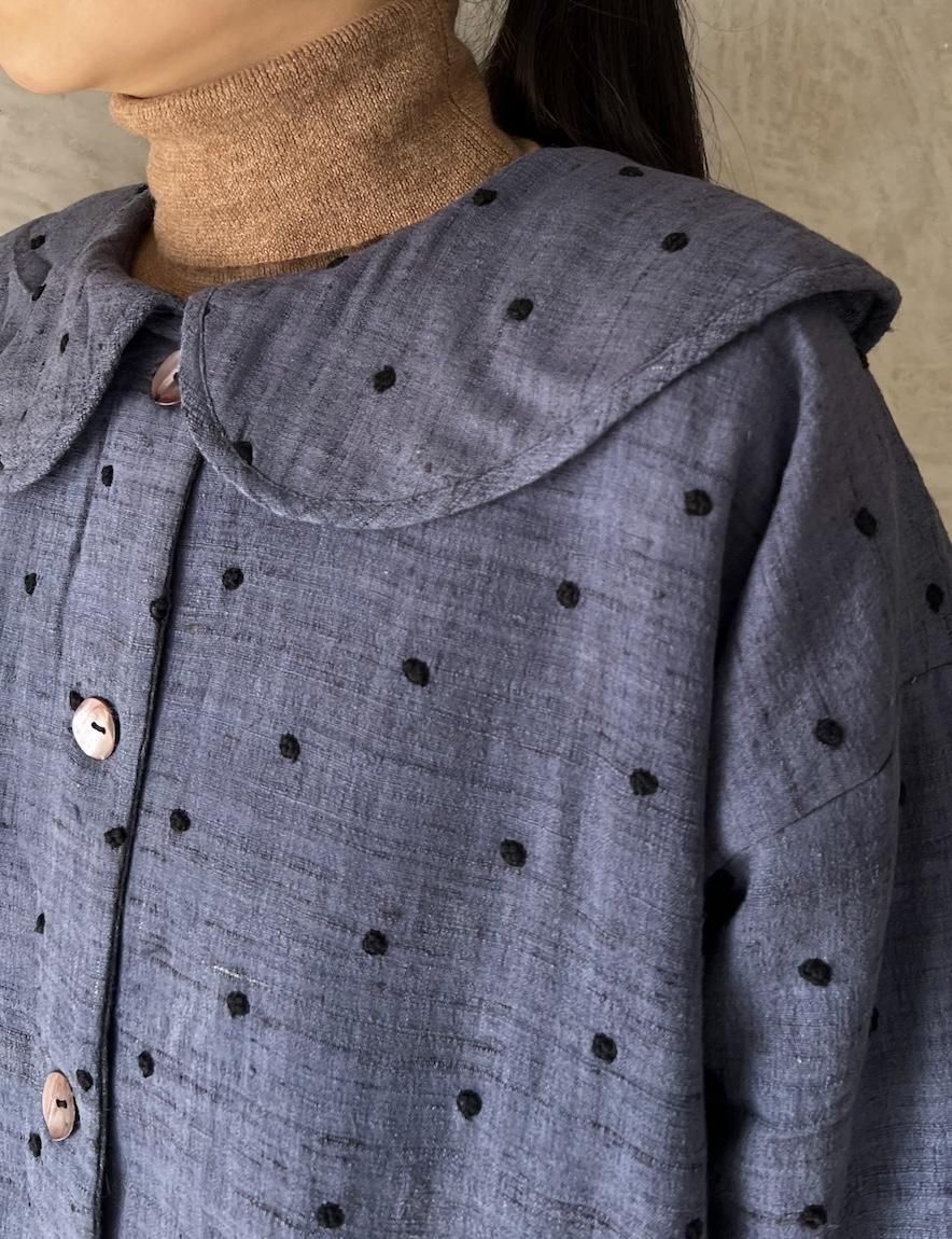 そのベース部分に黒のシルク糸でドットの手刺繍が施された愛らしいテキスタイル。