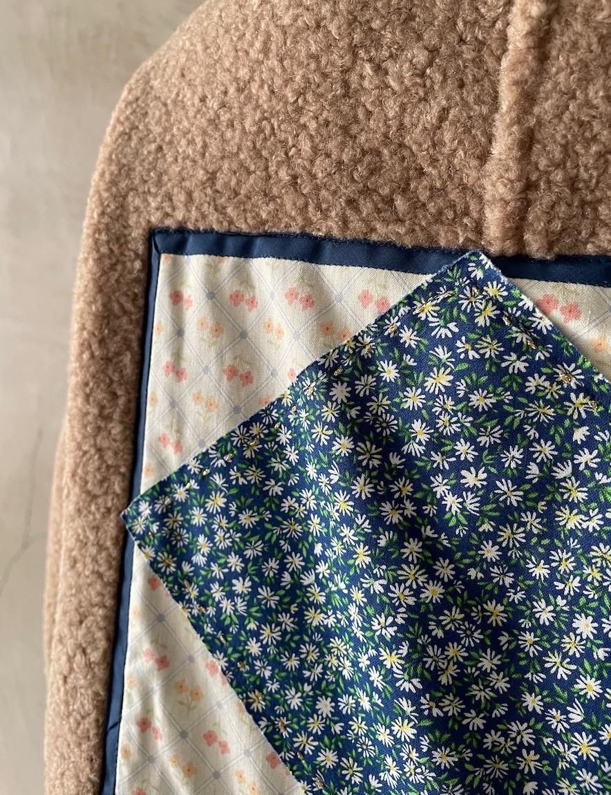 背中には大きなパッチワーク。ゴールドのステッチが入っています。